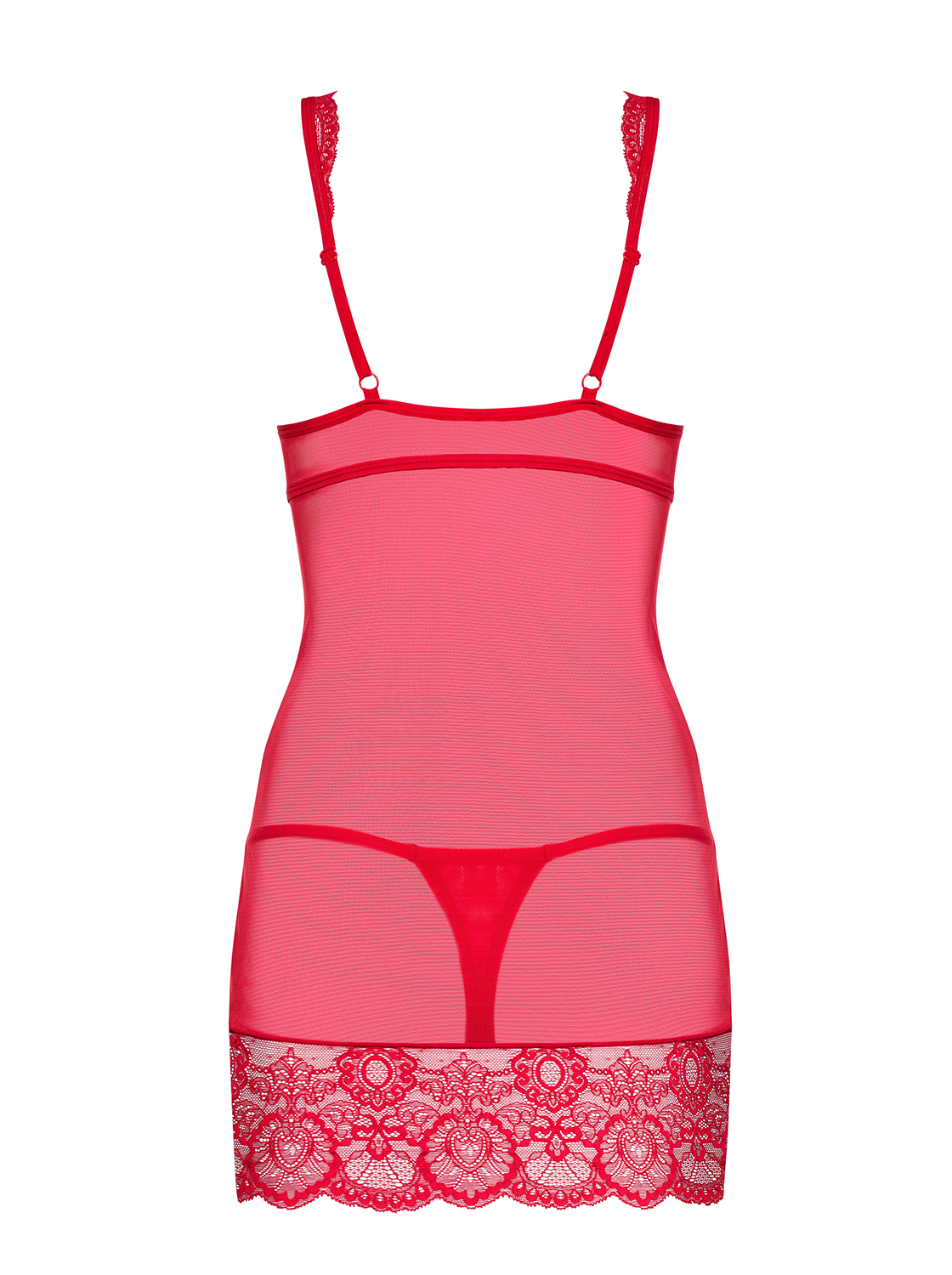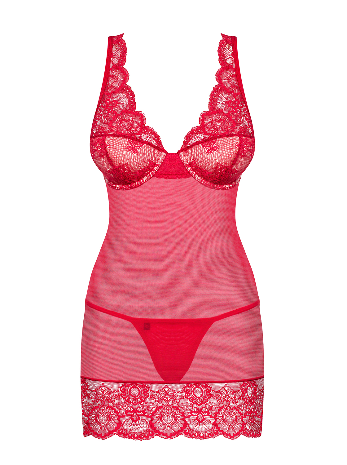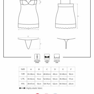 Unglaublich feminines Chemise mit gepolsterten, spitzenverzierten Bügel-Cups und einem breiten Spitzensaum. Mit verstellbaren Trägern und einem passenden String. Weiches und elastisches Material.