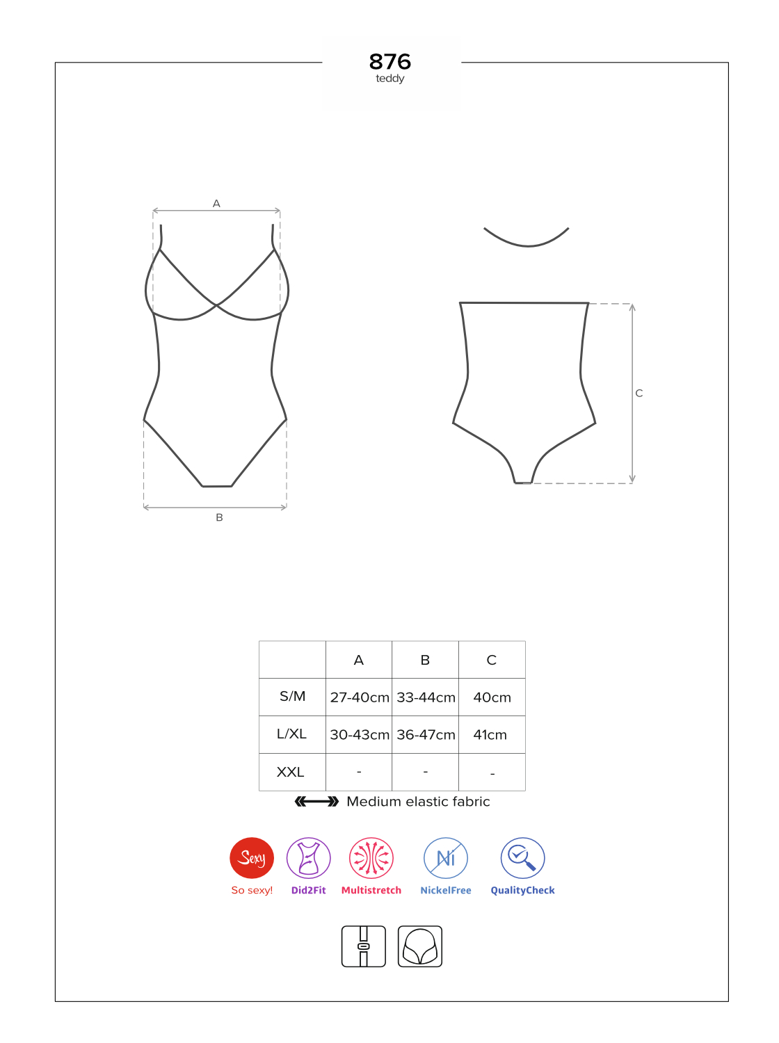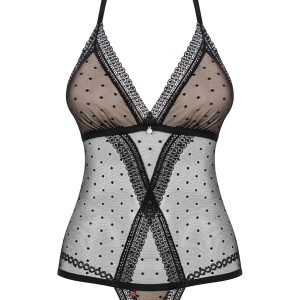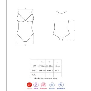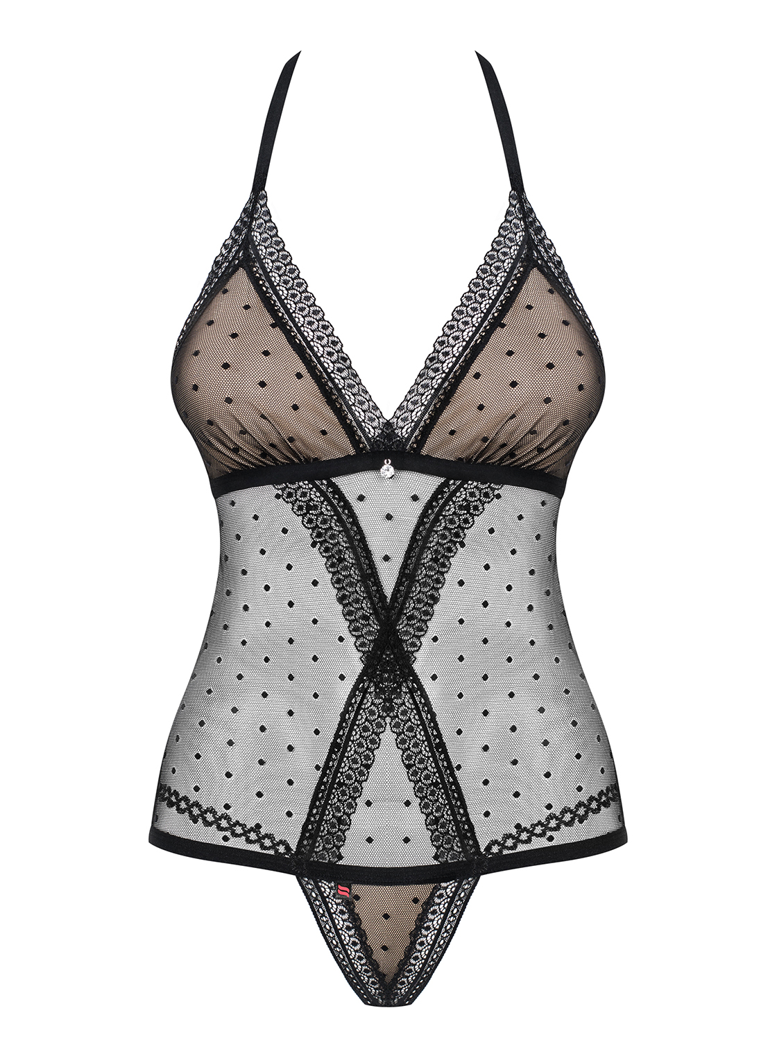Sexy Teddy mit dezentem Dottie-Muster, weichen Cups und verstellbarem Neckholder für perfekten Tragekomfort. Mit einem glänzenden Schmuckelement (nickelfrei). Die kreuzförmige Verzierung am Bauch und an der Hüfte sorgt für einen schlanken Look. Der Po wird durch den Tangaschnitt perfekt in Szene gesetzt. Das Multistretch-Material ist sehr elastisch und garantiert eine hervorragende Passform.