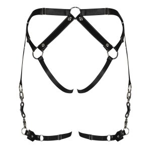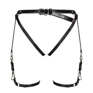 Außergewöhnliches Geschirr aus glänzendem und komfortablem Kunstleder mit silbernen Nieten. Mehrfach verstellbar und mit einer Schnalle am Bauch für eine perfekte Passform. Die Kombination aus Riemchen und Metallringen setzt Po und Hüfte verführerisch in Szene.