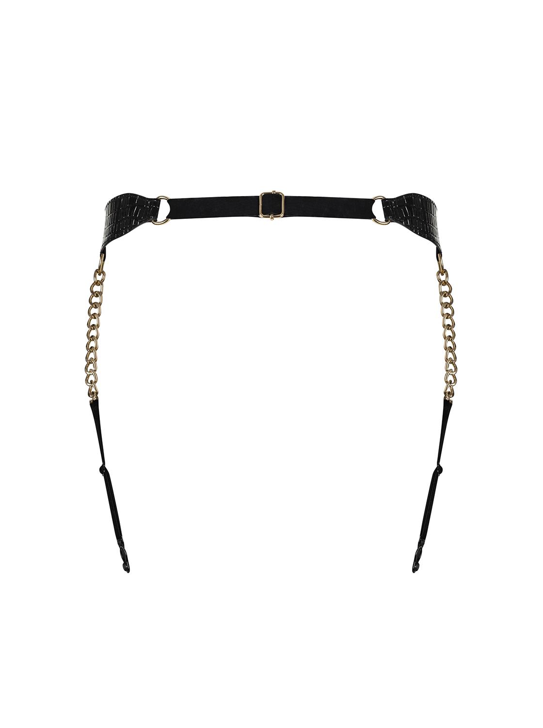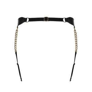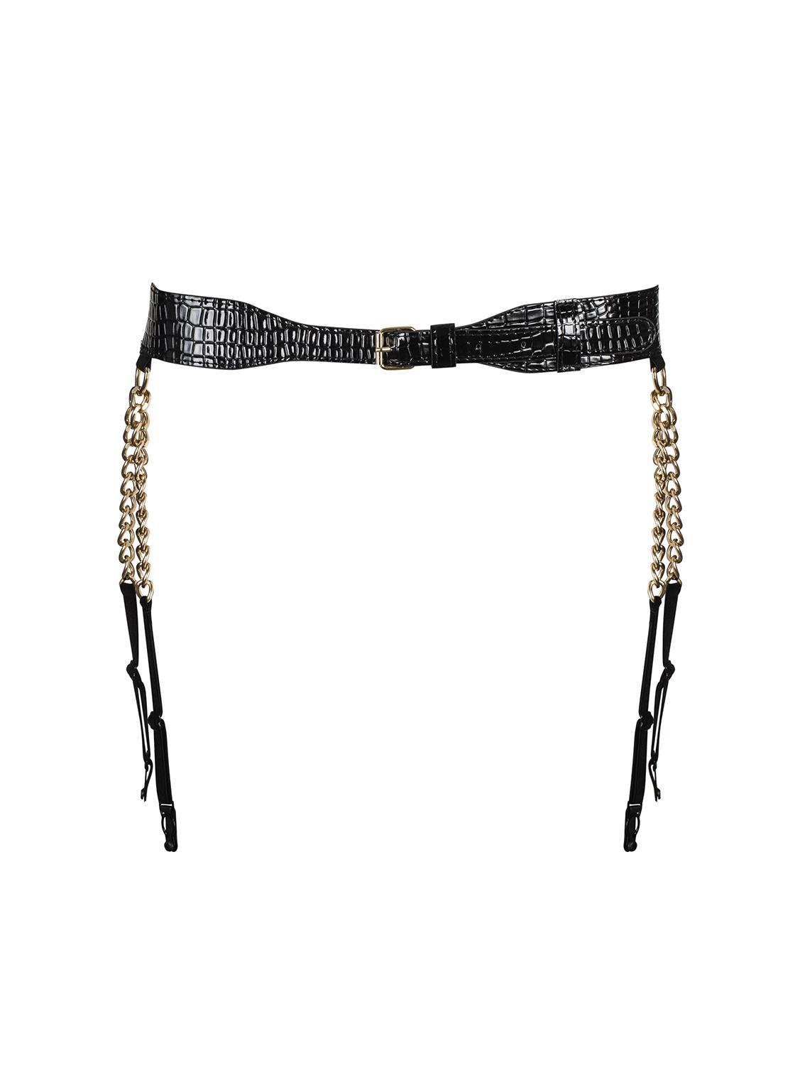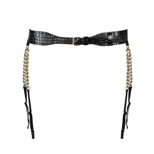 Exotischer Strumpfhaltergürtel aus geprägtem Kunstleder in schwarz mit Verstellmöglichkeiten an der Taille und den Strumpfhaltern sowie einem Schnallenverschluss am Bauch. Mit Gliedern in Form von goldfarbenen Ringen und Ketten. Weiches und hautfreundliches Material.