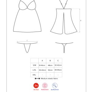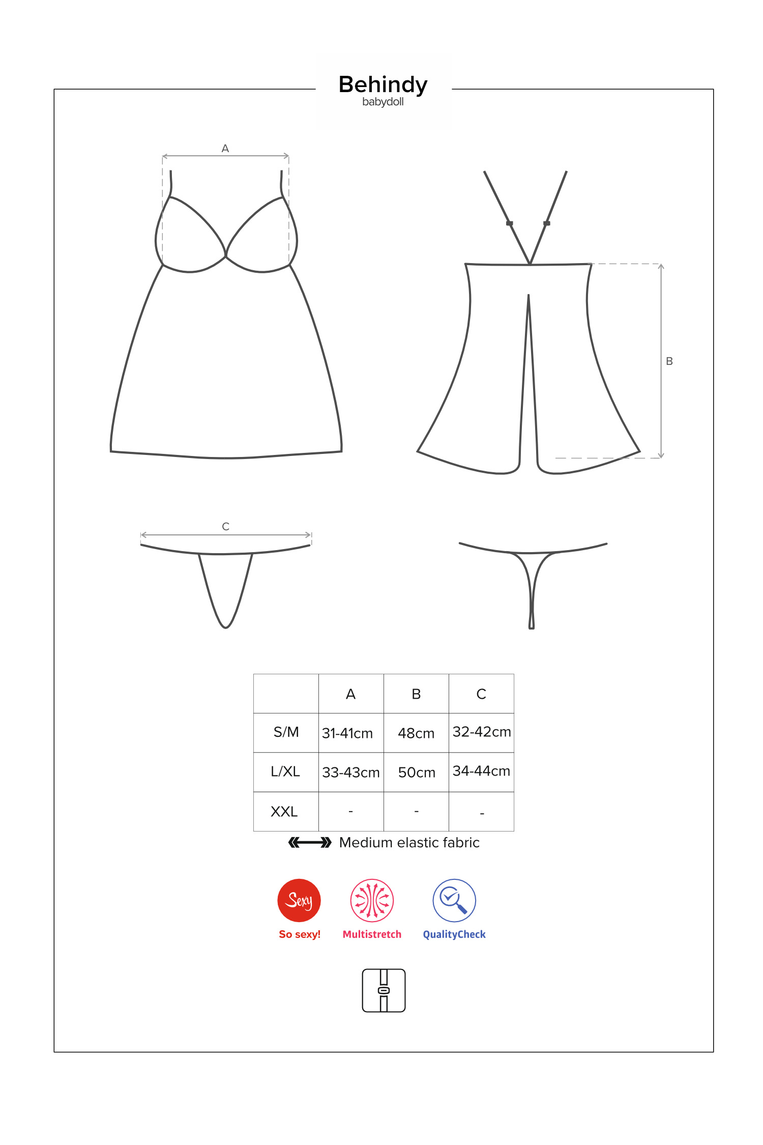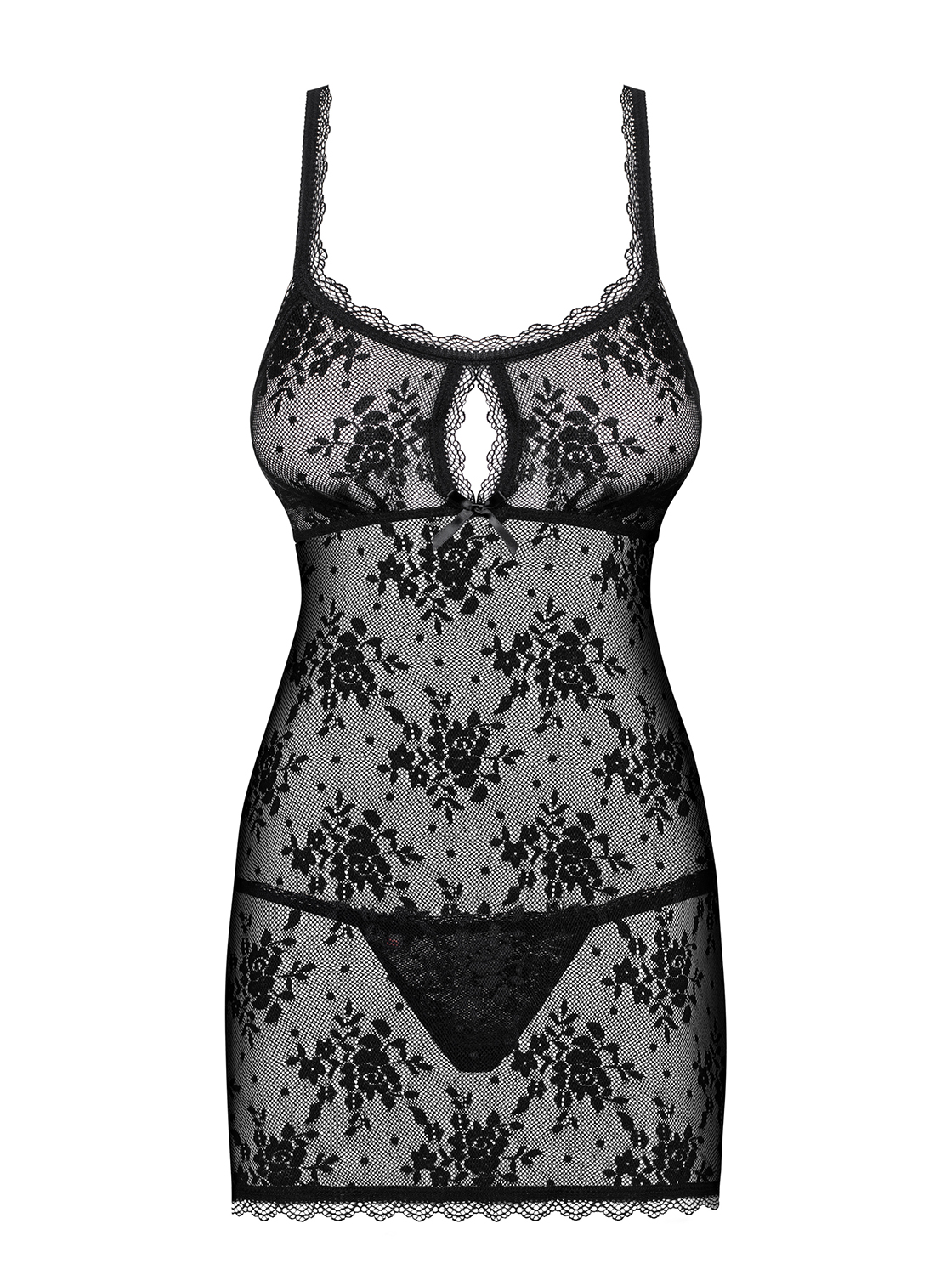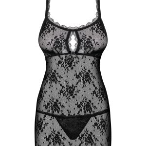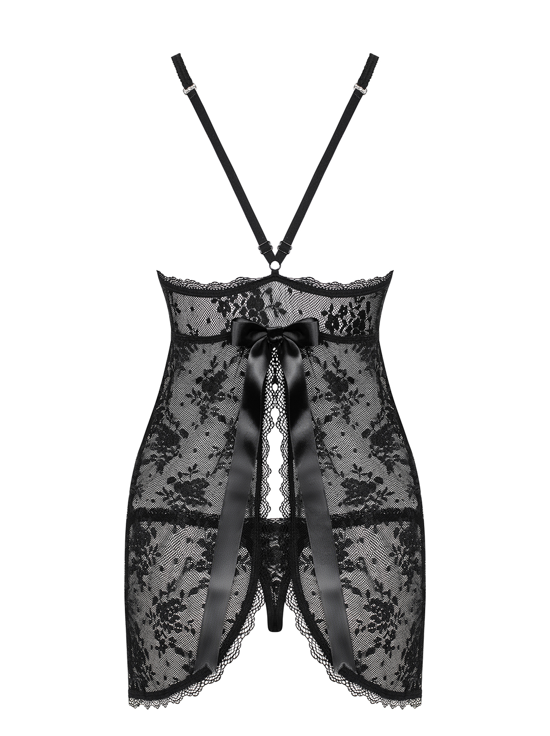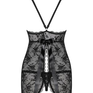 Elegantes, schwarzes Babydoll aus transparentem Mesh mit floraler Spitze und glänzenden Schmuckdetails. Mit einem verführerischen Brustausschnitt und hinten mit einer langen Satinschleife. Die verstellbaren, v-förmigen Träger sorgen für eine perfekte Passform und ergänzen den dreieckigen Ausschnitt auf der Rückseite. Passender String inklusive. Weiches und elastisches Material.
