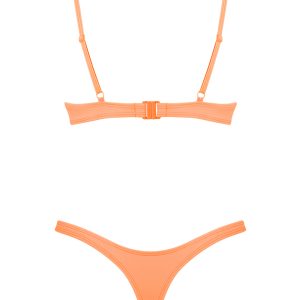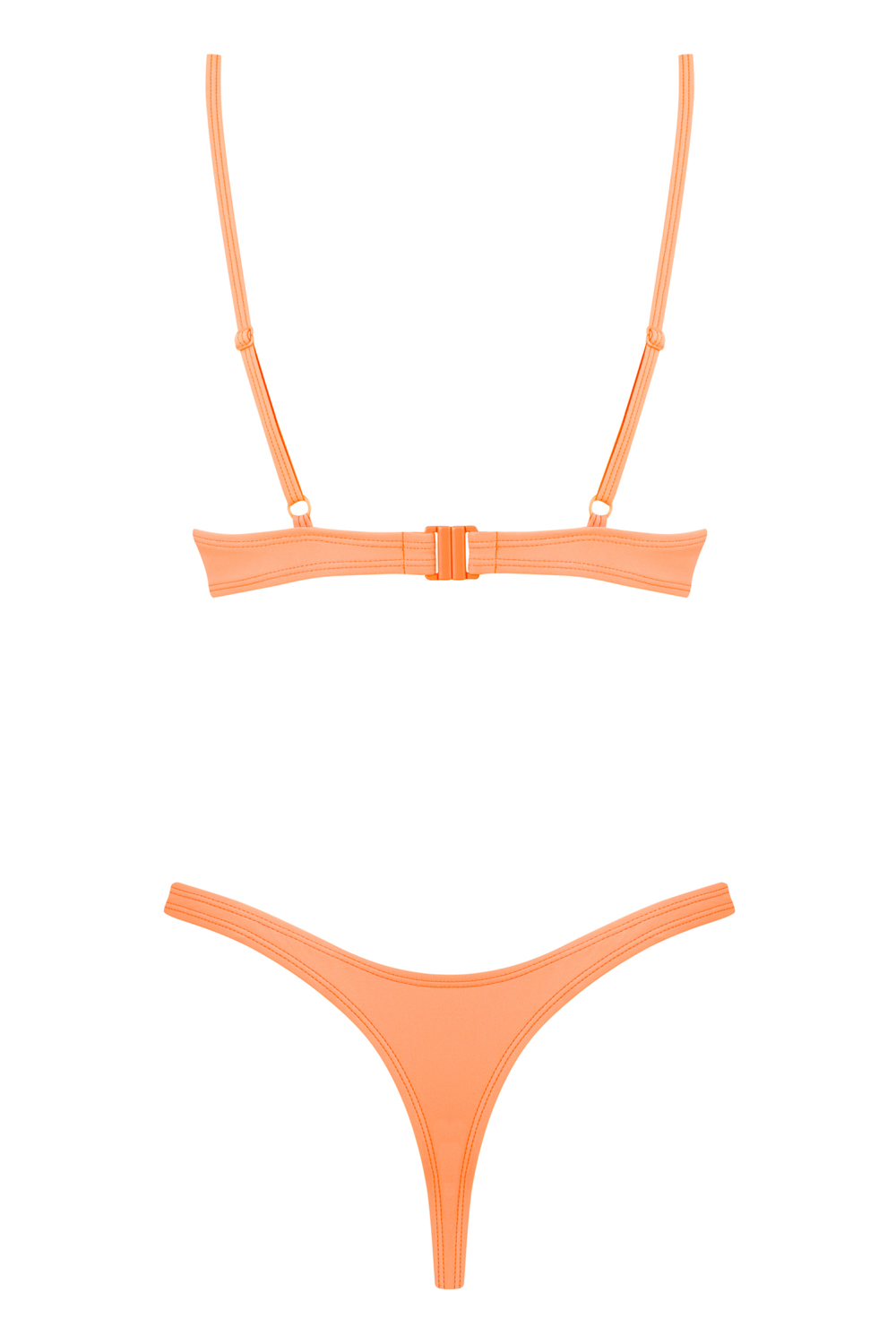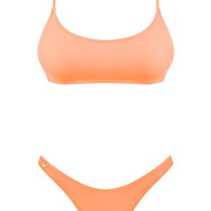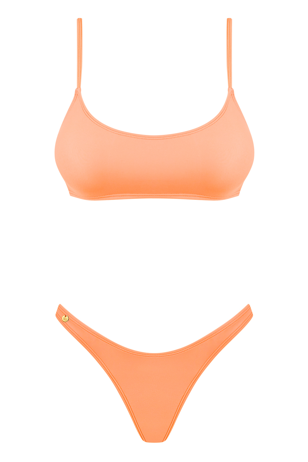 Atemberaubender Bikini in einem sommerlichen Korallton. Das sportliche Oberteil mit verstellbaren Trägern und Rückenverschluss betont die Brust. Das Unterteil im 90er-Jahre-Stil setzt Beine und Po perfekt in Szene. Elastisches und schnell trocknendes Material.