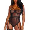Reizender Bodystocking aus elastischem Netzmaterial mit gemusterter Spitze vorne und hinten. Mit offenen Cups und Neckholder-Ausschnitt mit Spitzendetail und verstellbarem Verschluss. Die elastischen Strumpfhalter und oberschenkelhohen Strümpfe sind angenäht. Nipple Covers nicht inklusive.