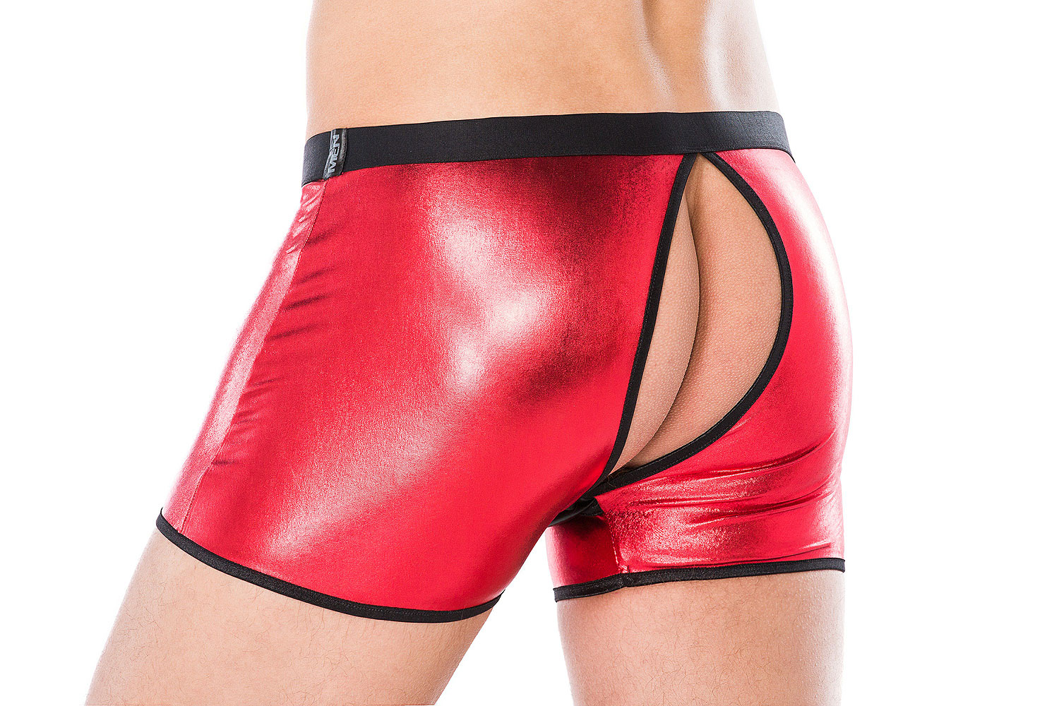 Rote und schwarze Wet-Look-Boxershorts mit nickelfreien Karabinern auf der Vorderseite und Öffnung auf der Rückseite. In exklusiver, neutraler Geschenkverpackung in mattschwarz!