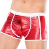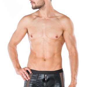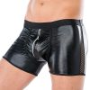 Schwarze Boxershorts aus Wet-Look-Material mit Reißverschluss und Netzstreifen auf der Vorderseite. Alle Metallteile sind nickelfrei. In exklusiver, neutraler Geschenkverpackung in mattschwarz!