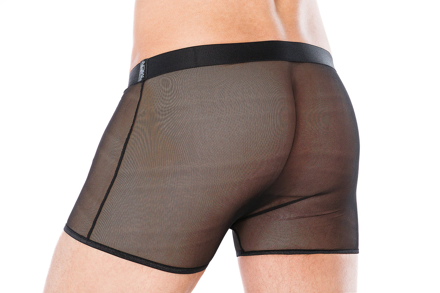 Schwarze Boxershorts aus transparentem Material und schwarzem Wet-Look-Material auf der Vorderseite. Mit einem silbernen, nickelfreien Reißverschluss. In exklusiver, neutraler Geschenkverpackung in mattschwarz!