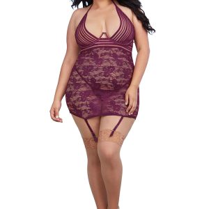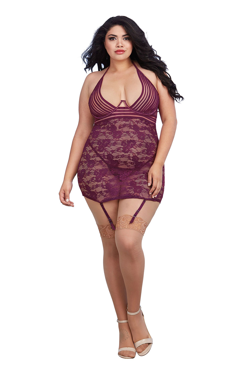 Chemise aus elastischer, transparenter Spitze mit eleganten Streifendetails, Bügel-Cups und großzügigem Dekolleté,. Mit Rückenausschnitt und Neckholder zum Binden sowie verstellbaren, elastischen Trägern am Rücken. Die Strumpfhalter sind abnehmbar und verstellbar, ein passender Spitzenstring ist inklusive. Die abgebildeten „Strümpfe DR0007 skin“ sind nicht im Lieferumfang enthalten und separat erhältlich.