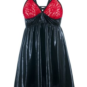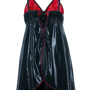 Chemise aus schwarzem Wetlook-Material mit Cups aus sinnlicher, roter Spitze. Durch verstellbare Träger und die lange Rückenschnürung lässt sich das Chemise an jeden Figurentyp anpassen. Lieferung in neutraler Geschenkverpackung!