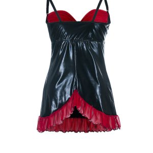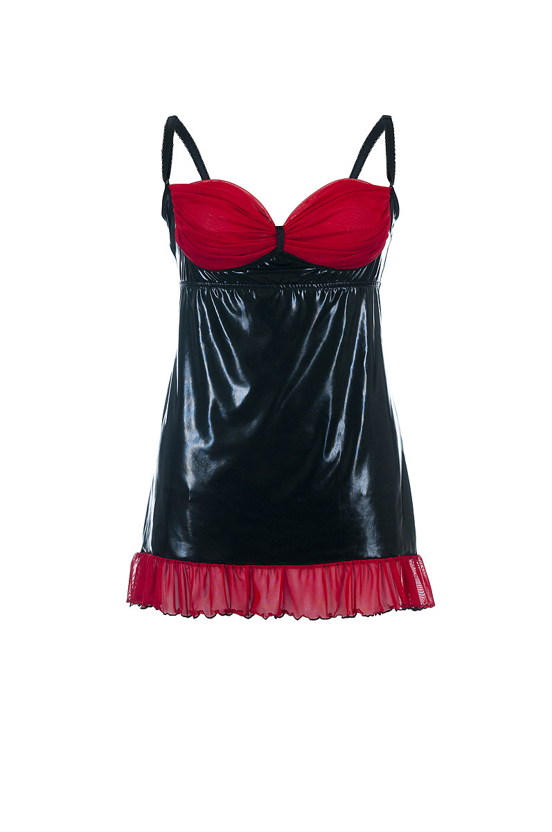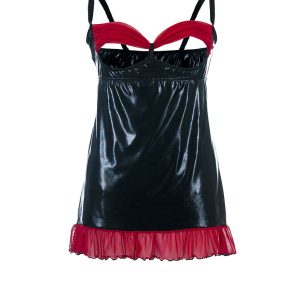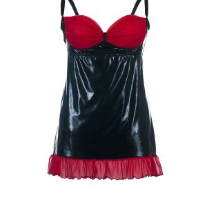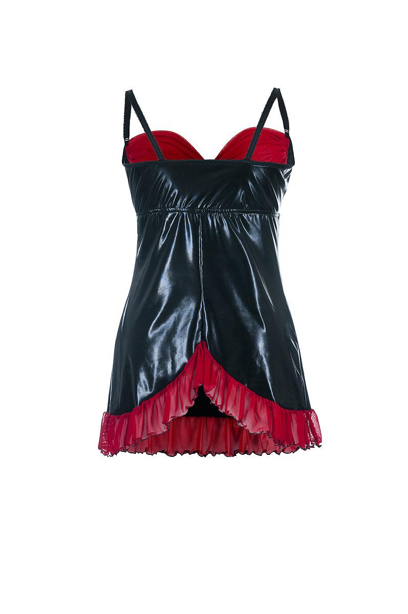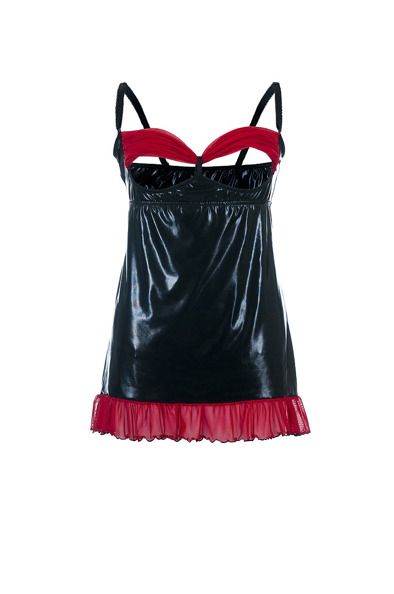 Kokettes Chemise aus schwarzem Wetlook-Material mit transparenten, roten BH-Cups aus Tüll sowie einem zarten Volant am unteren Saum. Die BH-Cups sind nicht am Chemise befestigt, so dass man die Brust mit einer Handbewegung entblößen kann. Mit verstellbaren Trägern. Lieferung in neutraler Geschenkverpackung!