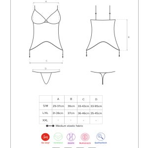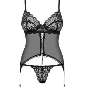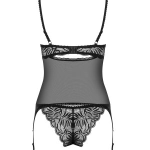 Atemberaubende Corsage aus transparentem Mesh und femininer Spitze mit Bügel-Cups, verstellbaren Trägern und Verschluss für eine perfekte Passform. Mit sexy Rückenausschnitt, einer Schleife und Shnürung aus Satinmaterial. Passendes Spitzenhöschen inklusive. Schönes und elastisches Multistretch-Material.