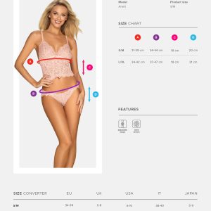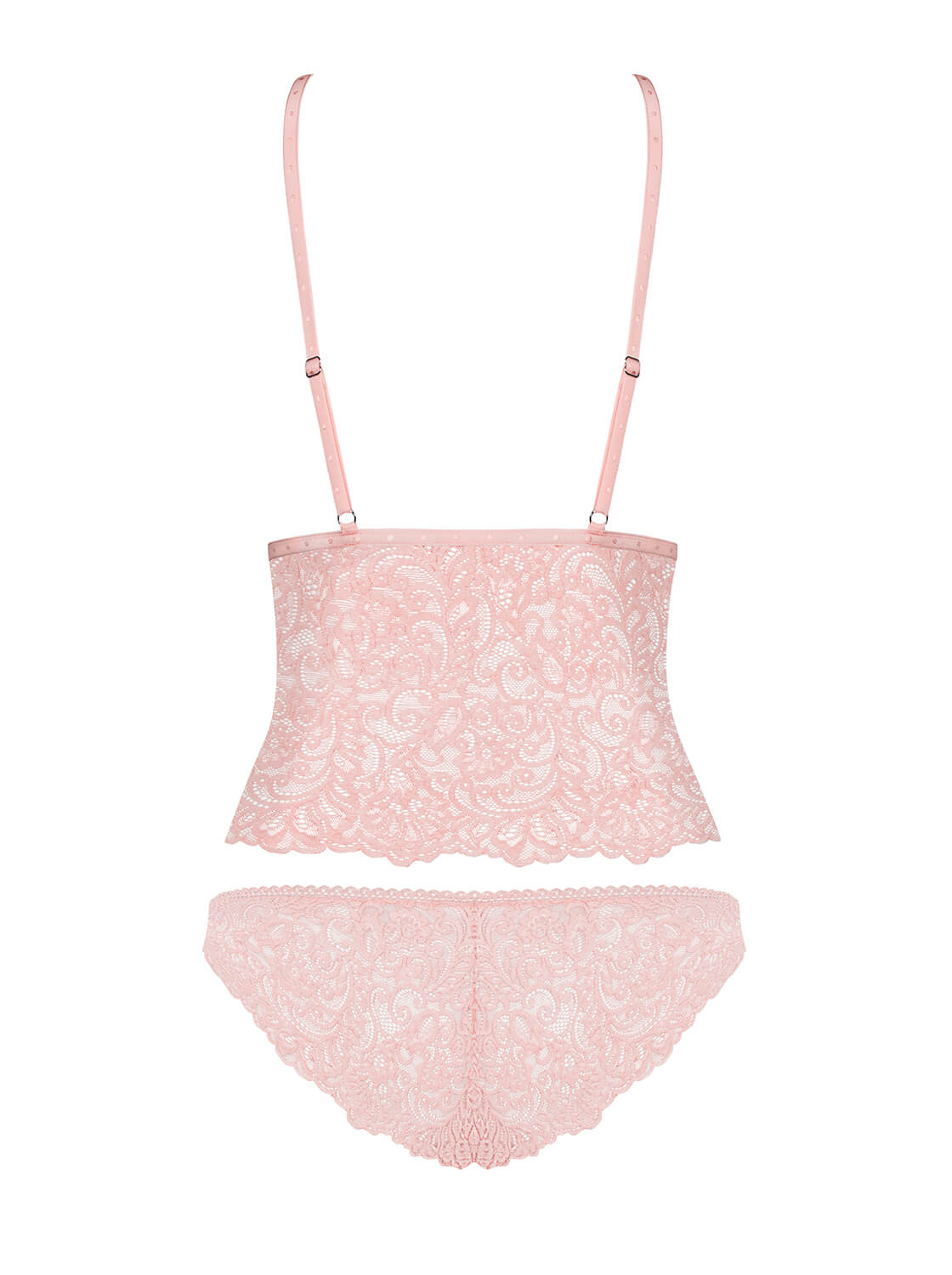 Wunderschönes, rosafarbenes Top mit passendem Höschen aus weicher und elastischer Multistretch-Spitze. Das knapp geschnittene Top hat Softcups und verstellbare Träger für eine perfekte Passform. Das elegante Spitzenhöschen betont Beine und Po. Verspielte Schleifen setzen einen charmanten Akzent.