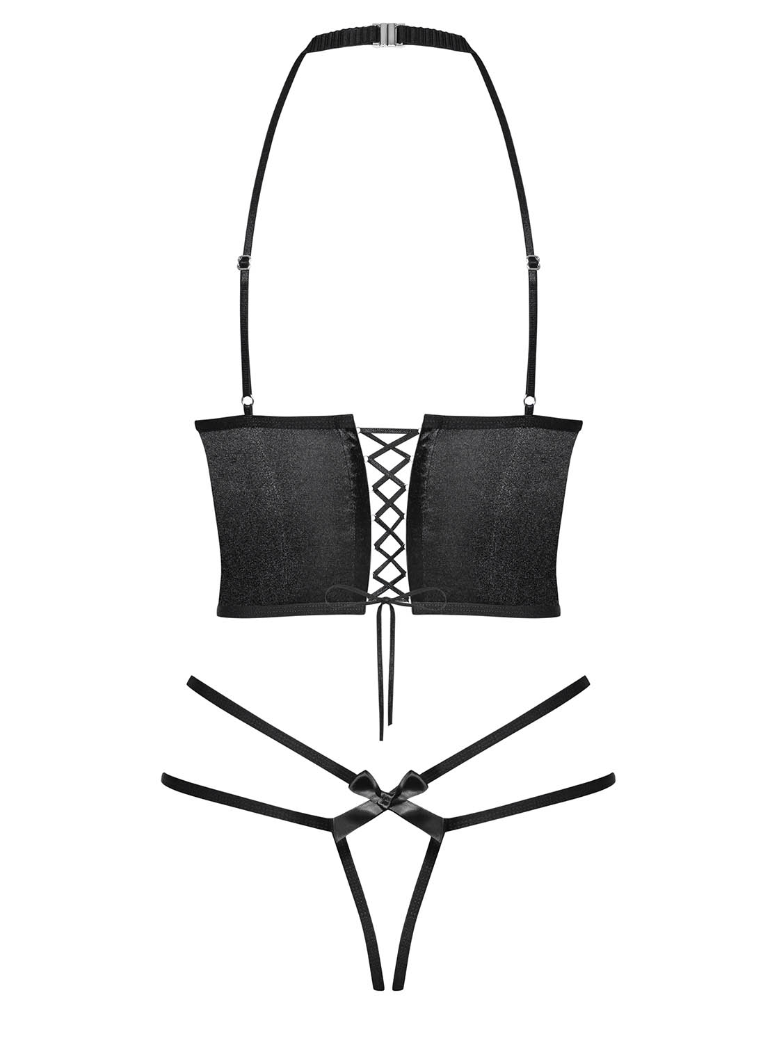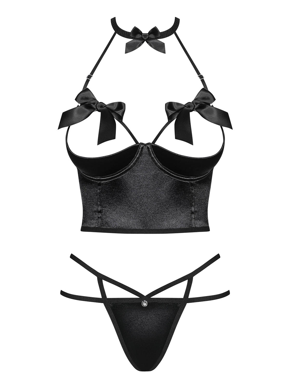 Auffälliges, schwarzes Dessous-Set aus glänzendem Satinmaterial und elastischen Riemchen. Ein Neckholder-Top mit Rückenschnürung, verstellbaren Trägern, offenen Bügel-Cups und charmanten Schleifen. Dazu ein passender Doppelriemchen-String mit einem eleganten Anhänger vorne und einer Schleife über dem Po.