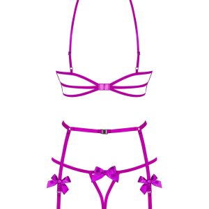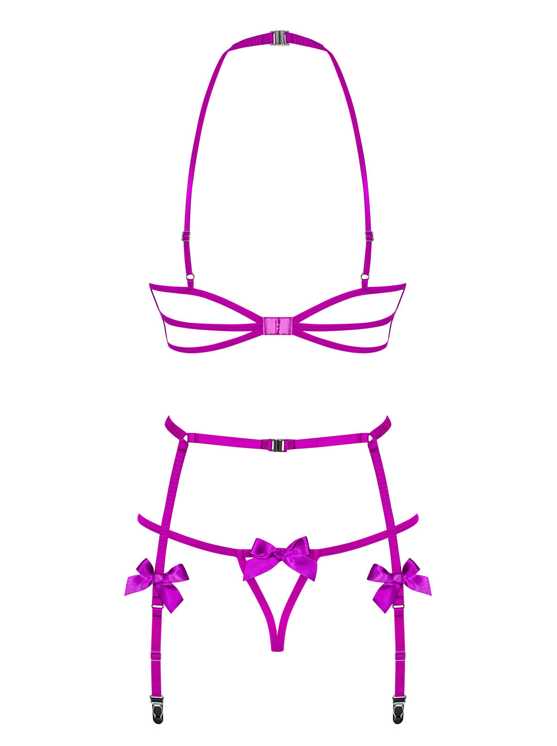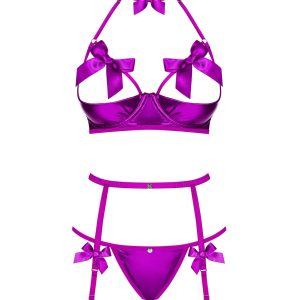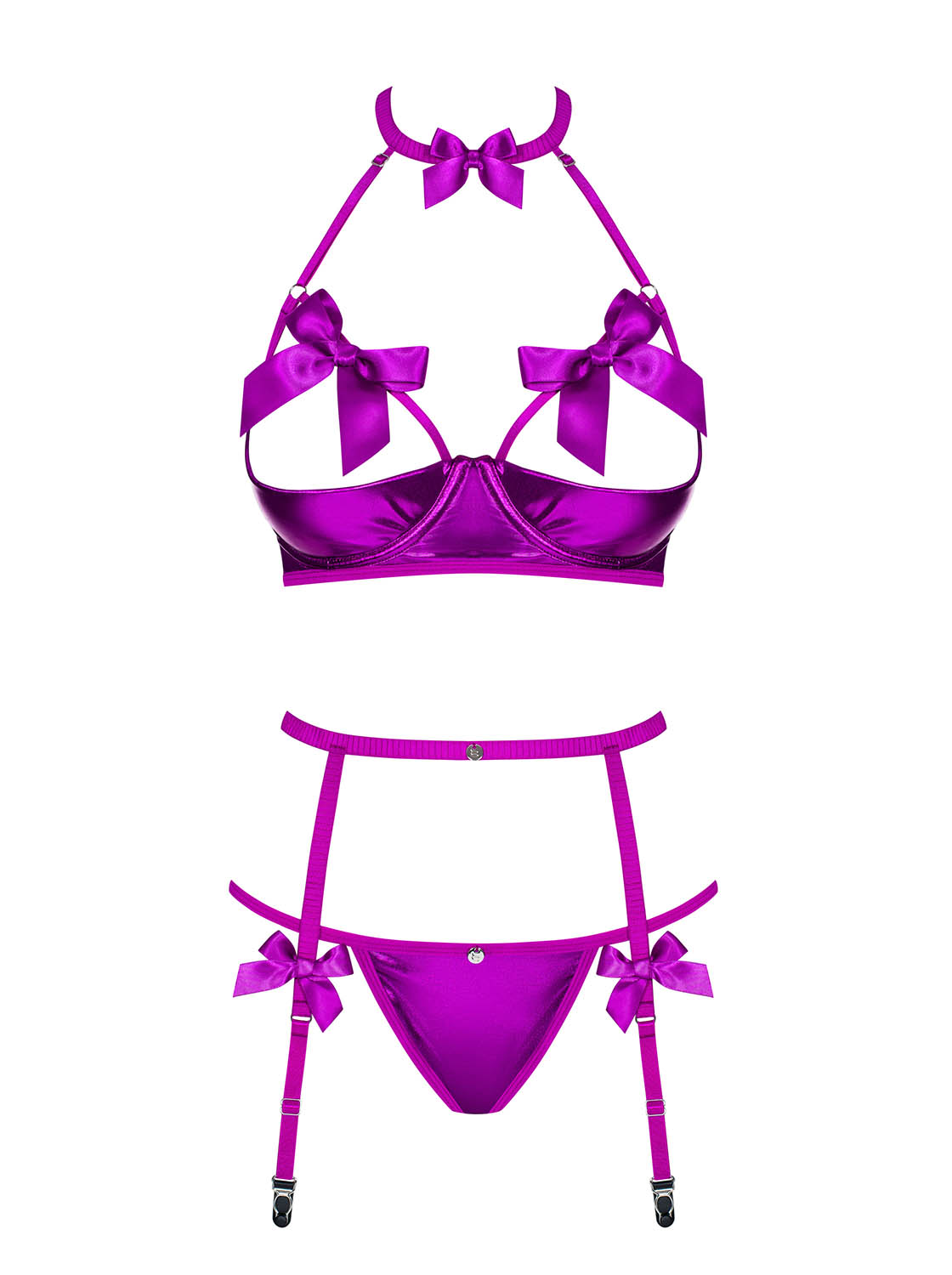 Auffälliges, violettes Dessous-Set aus glänzendem Metallic-Material und elastischen Riemchen. Ein Neckholder-Top mit Rückenverschluss, verstellbaren Trägern, offenen Bügel-Cups und charmanten Schleifen. Dazu ein elastischer und verstellbarer Strumpfhaltergürtel mit Schleifen und Schmuckdetail sowie ein passender String mit Anhänger. Die abgebildeten Strümpfe sind nicht im Lieferumfang enthalten.