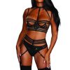 Elastisches Dessous-Set mit offenem Bügel-BH, einem Rock mit zwei Strumpfhaltern und einem passenden G-String. Mit verstellbaren Trägern, gold glänzenden Ringen und Details sowie mehrstufigen Hakenverschlüssen auf der Rückseite. Die abgebildeten „Strümpfe DR0007 schwarz“ sind nicht im Lieferumfang enthalten und separat erhältlich. Verpackt in einer wiederverschließbaren PVC-Hülle.