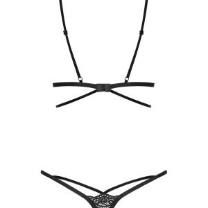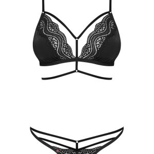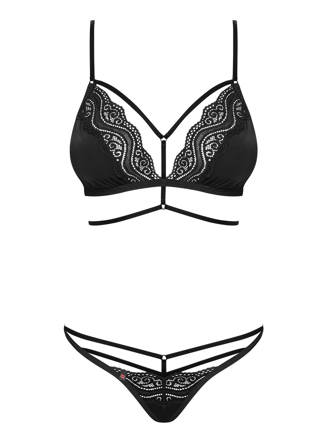 Reizendes Dessous-Set aus weichem und elastischem Multistretch-Material in schwarz mit elastischen Riemchen an Dekolleté, und Bauch. Mit verstellbaren Trägern und mehrstufigem BH-Verschluss für eine perfekte Passform. Passender Spitzenstring mit elastischen Riemchen inklusive.