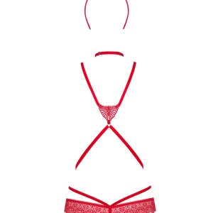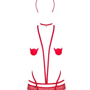Teuflisch heißer, roter Body aus elastischen Riemchen, die Ihren Körper umschmeicheln und einem breiten Spitzenband an der Hüfte. Mit offenem Schritt und verstellbaren Trägern für eine perfekte Passform. Inklusive Halsreif, Hörner und Nippelabdeckungen.