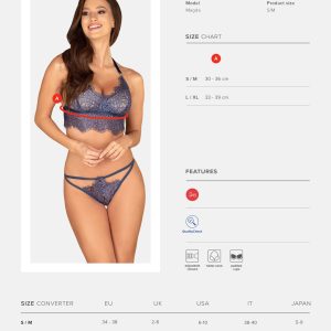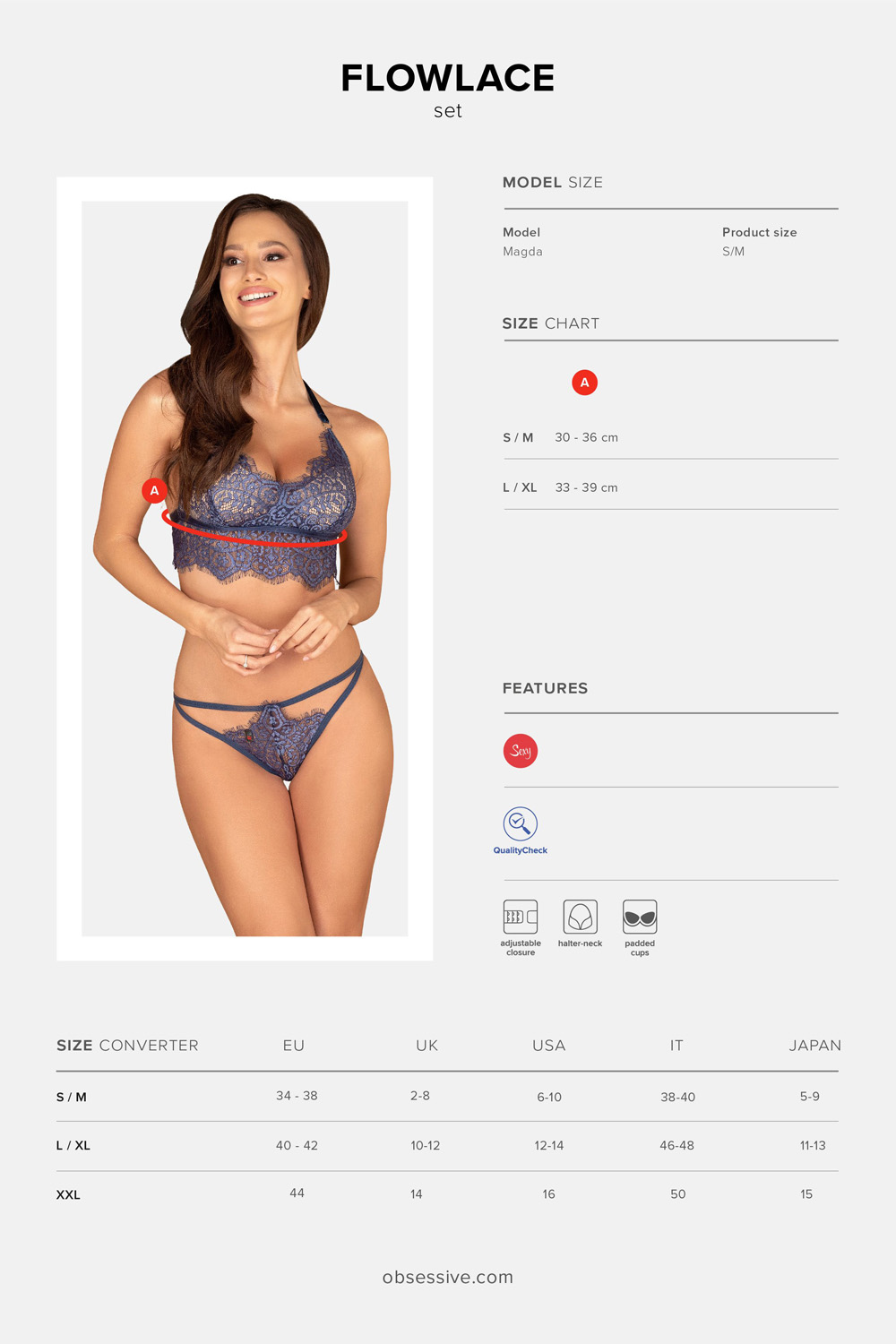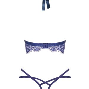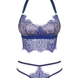 Charmantes Set aus weichem Material in blau mit sexy Spitzendetails und eleganter Wimpernspitze am Saum. Ein Top mit gepolsterten Cups, praktischem Neckholder und verstellbarem Rückenverschluss für eine perfekte Passform. Dazu ein passender Spitzenstring mit elastischen Riemchen und Wimpernspitze.