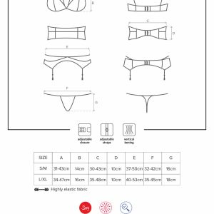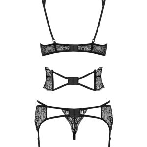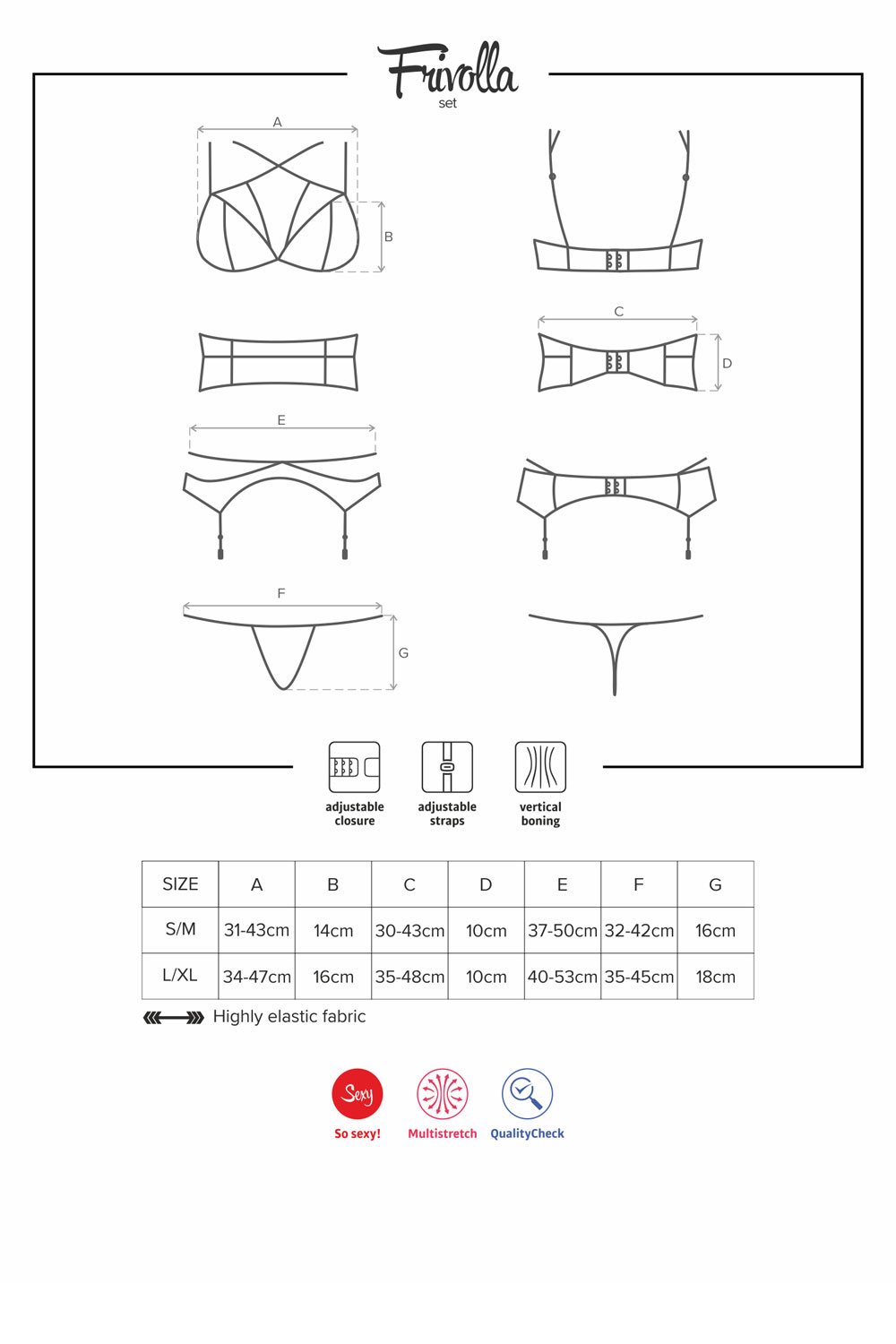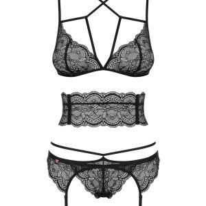 Erstaunliches Spitzen-Set aus weichem, elastischem Material. Ein Spitzen-BH mit verstellbaren Trägern und Verschluss sowie einer auffälligen Kombination aus elastischen Riemchen am Dekolletee. Ein Spitzengürtel mit vertikalen Linien und verstellbarem Verschluss für eine sexy Taille. Und ein leicht verstellbarer Strumpfhaltergürtel mit koketten Riemchen um den Hüftbereich. Passender String inklusive.