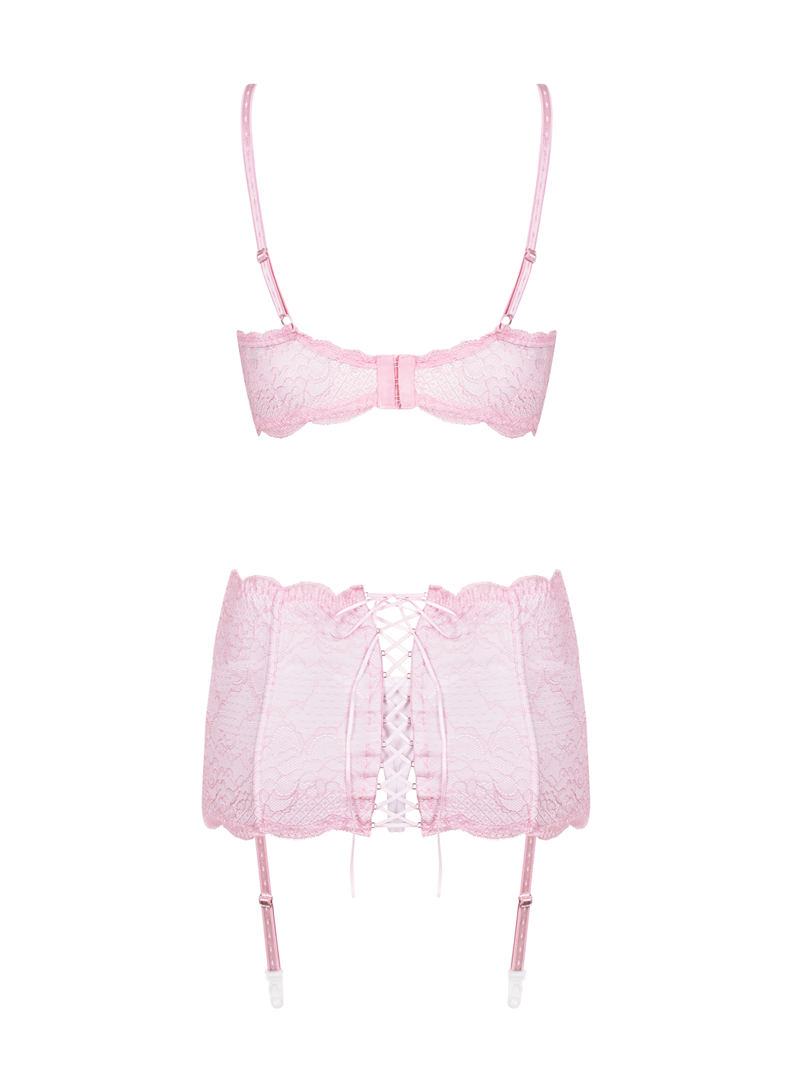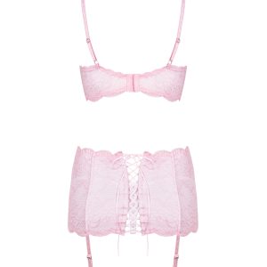 Feminines Set aus elastischem und weichem Multistretch-Material in weiß mit rosa Spitze und Schleifen. Das Set beinhaltet einen BH, einen Strumpfhaltergürtel und einen passenden String. Dank der verstellbaren Träger, einem mehrstufigen BH-Verschluss und gepolsterten Bügel-Cups ist es perfekt für Frauen mit großen Brüsten. Der breite Strumpfhaltergürtel mit vertikalen Nähten, verstellbaren Strumpfhaltern und einer Schnürung auf der Rückseite hat eine perfekte Passform und sorgt für einen fantastischen Look von Hüfte und Bauch. Die abgebildeten Girlly Stockings sind nicht im Lieferumfang enthalten und separat erhältlich.
