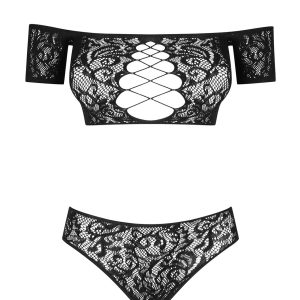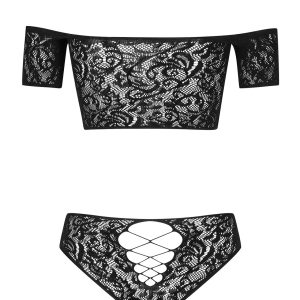 Schwarzes Top mit schulterfreiem Ausschnitt und hoch geschnittenen Höschen aus durchscheinendem und elastischem Material mit zartem Muster. Mit grobmaschigen Ausschnitten zwischen den Brüsten und über dem Po.