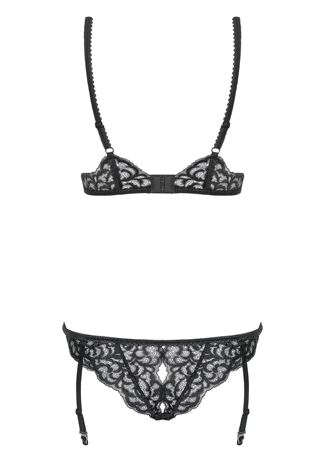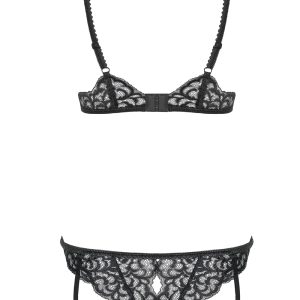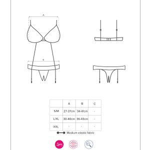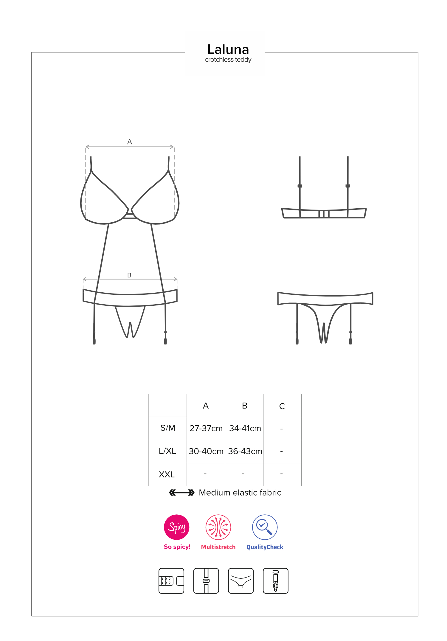 Verführerischer Body aus glitzerndem Multistretch-Material und schöner Spitze mit einem eleganten Schmuckdetail und einer Schleife. Der BH mit verstellbaren Trägern und mehrstufigem Verschluss ist durch zwei Riemchen mit dem Höschen verbunden. Mit offenem Schritt und abnehmbaren Strumpfhaltern. Die abgebildeten „Laluna Stockings“ sind nicht im Lieferumfang enthalten und separat erhältlich.
