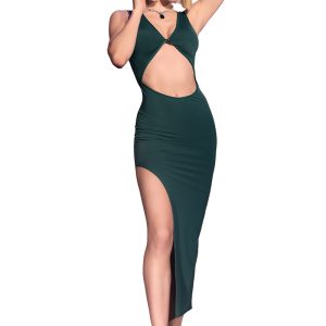 Fantastisches, langes Kleid aus weichem und elastischem Material in grün, das Ihre Kurven perfekt in Szene setzt. Mit geschlossener Rückseite, Ausschnitt am Bauch und einem seitlichen Schlitz, der Ihr Bein betont. Passender String inklusive.