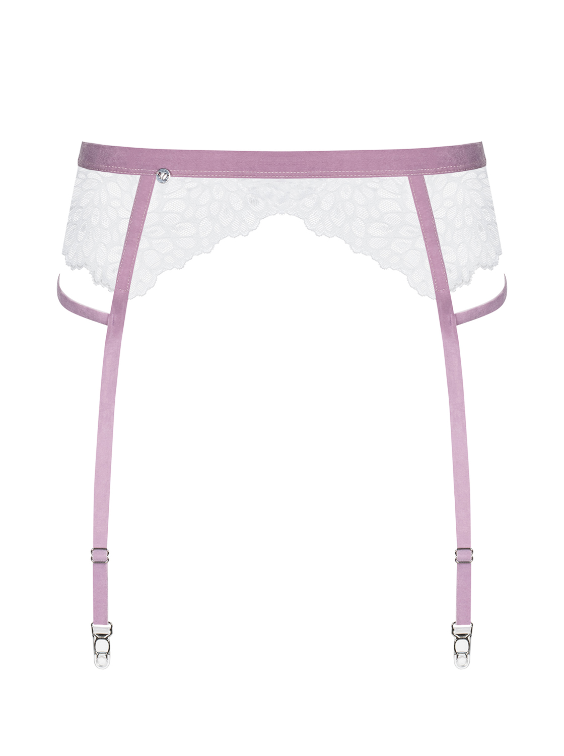 Femininer Strumpfhaltergürtel aus transparenter und floraler Spitze in weiß mit fliederfarbenen, weichen Samtriemchen und Strumpfhaltern. Mit mehrstufigem Verschluss und verstellbaren Strumpfhaltern für eine perfekte Passform. Angenehmes und elastisches Material. Der abgebildete String und die „Lilyanne Stockings“ sind nicht im Lieferumfang enthalten.
