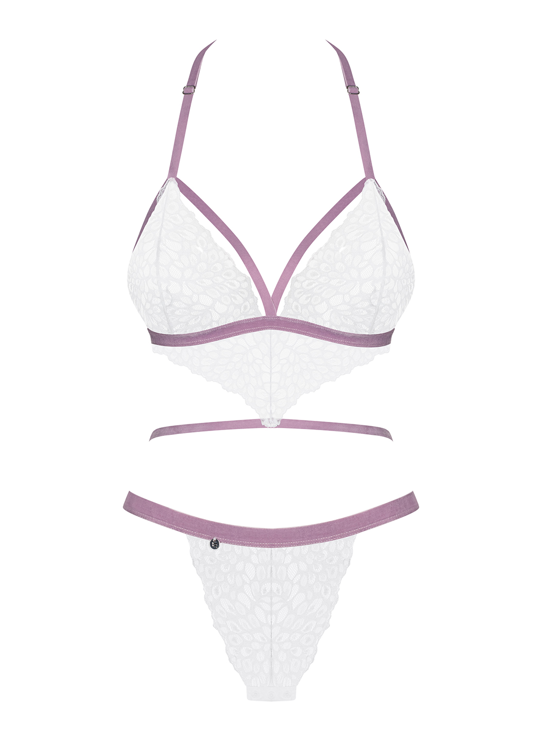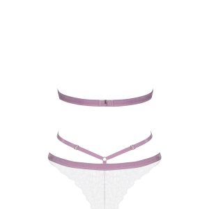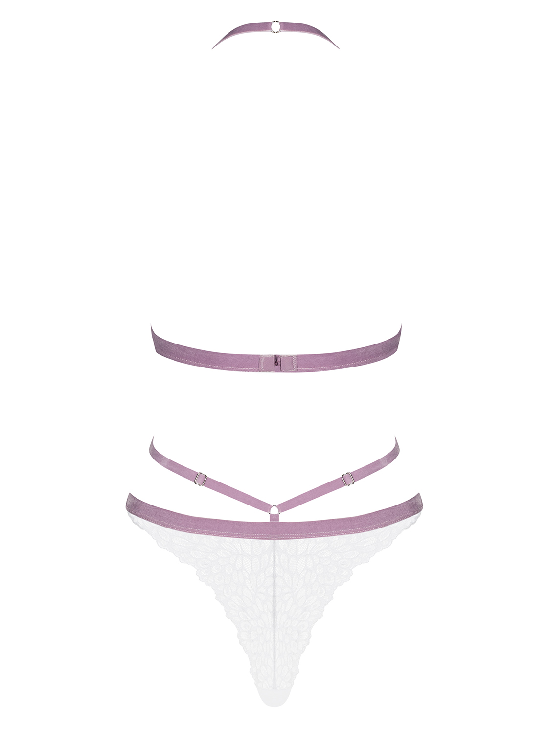 Außergewöhnlicher Body mit geometrischem Schnitt, verstellbarem Neckholder und elastischen Riemchen. Aus transparenter und floraler Spitze in weiß mit fliederfarbenen, weichen Samtriemchen. Mit dreieckigen Cups und mehrstufigem Rückenverschluss.