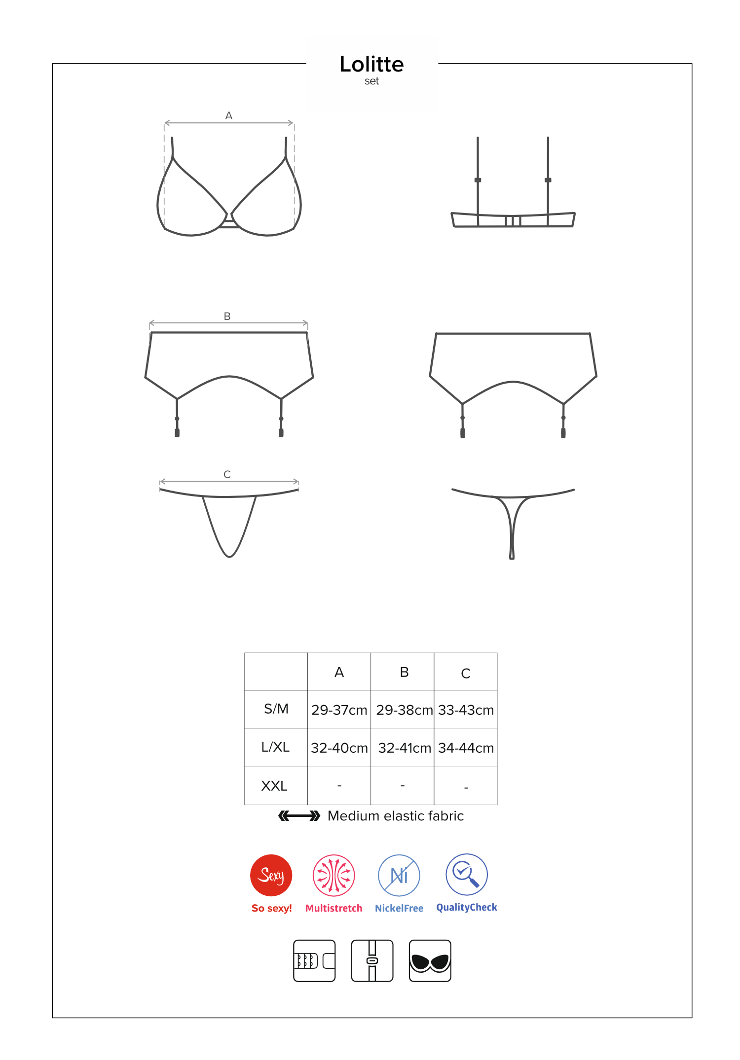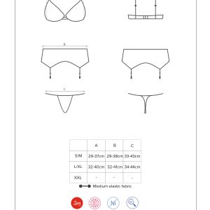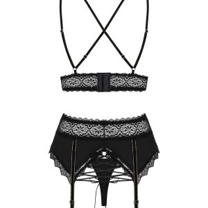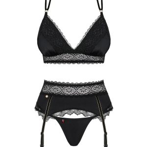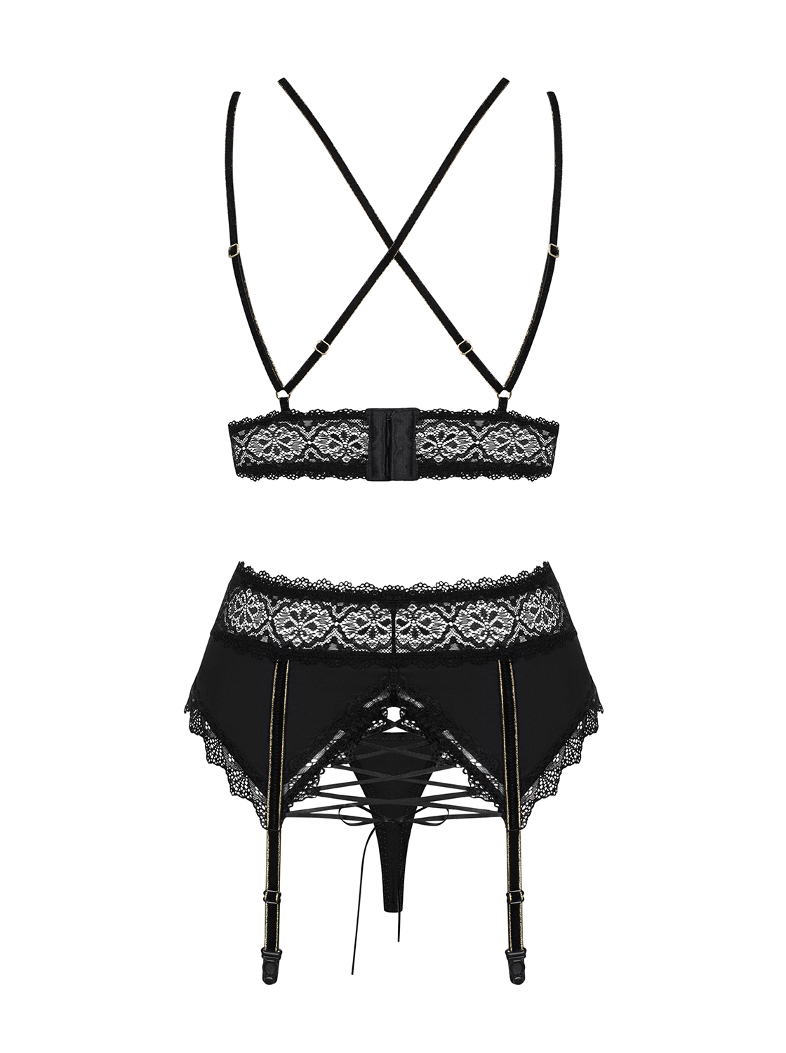 Dreiteiliges Set bestehend aus BH, Strumpfhaltergürtel und String. Ein gepolsterter BH mit vier verstellbaren, samtigen Trägern, die sich am Rücken kreuzen. Mit mehrstufigem Verschluss für eine perfekte Passform. Ein Strumpfhaltergürtel mit verführerischer Schnürung und verstellbaren Haltern. Schwarze Spitze verleiht dem Set einen charmanten Look, goldene Details und Schmuckelemente versprühen einen Hauch von Luxus. Zartes und elastisches Material. Passender String inklusive. Die abgebildeten „S800 Stockings schwarz“ sind nicht im Lieferumfang enthalten und separat erhältlich.