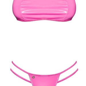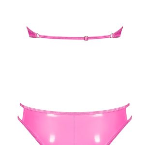 Auffälliges Wetlook-Set aus pinkem Kunstleder und Saum in zartrosa. Ein BH mit verstellbarem Riemchen am Rücken und Brustnähten. Dazu ein String mit gemütlichem ComfyCut-Schnitt, speziellen Nähten und sexy Riemchen an der Hüfte.