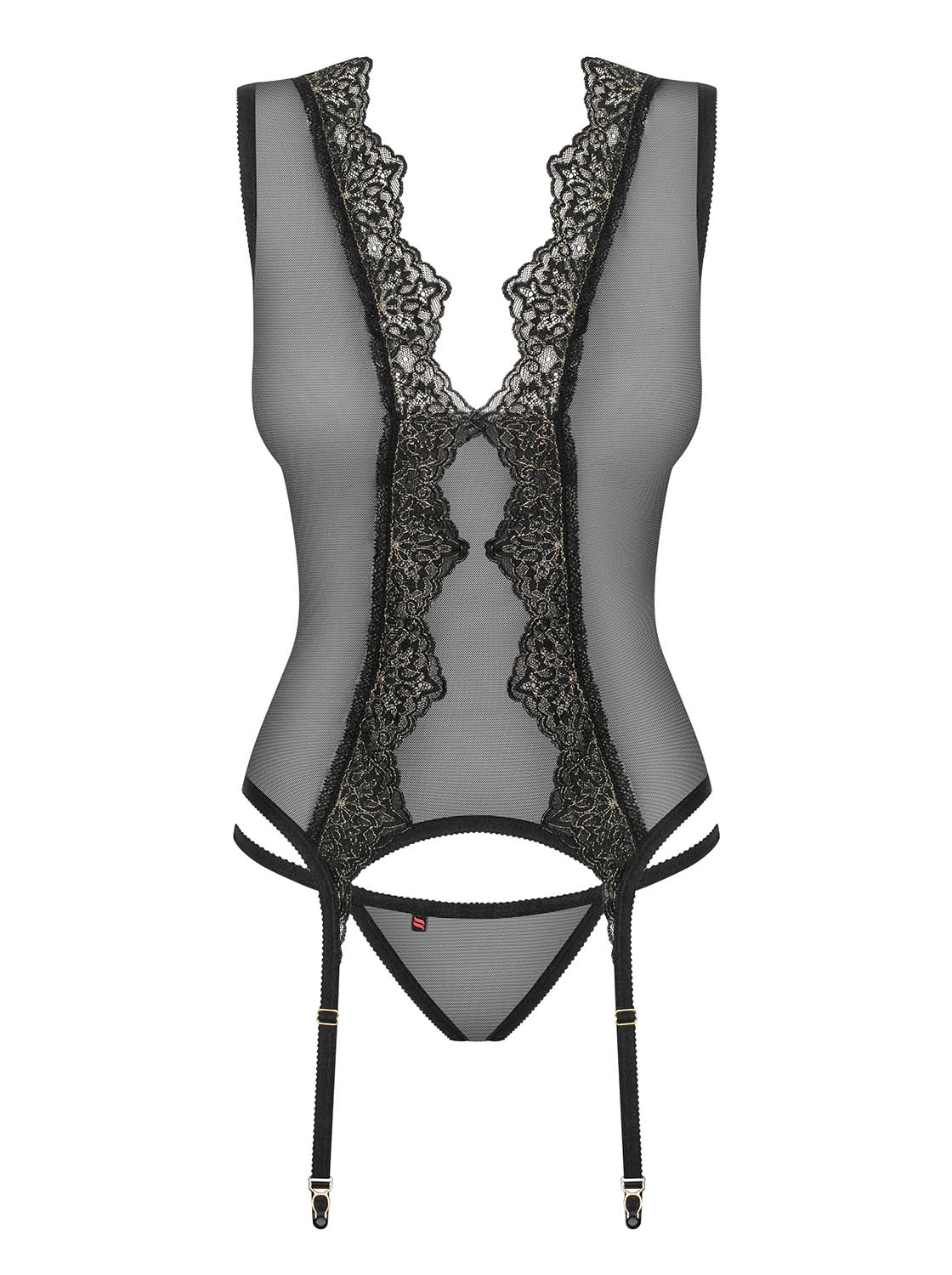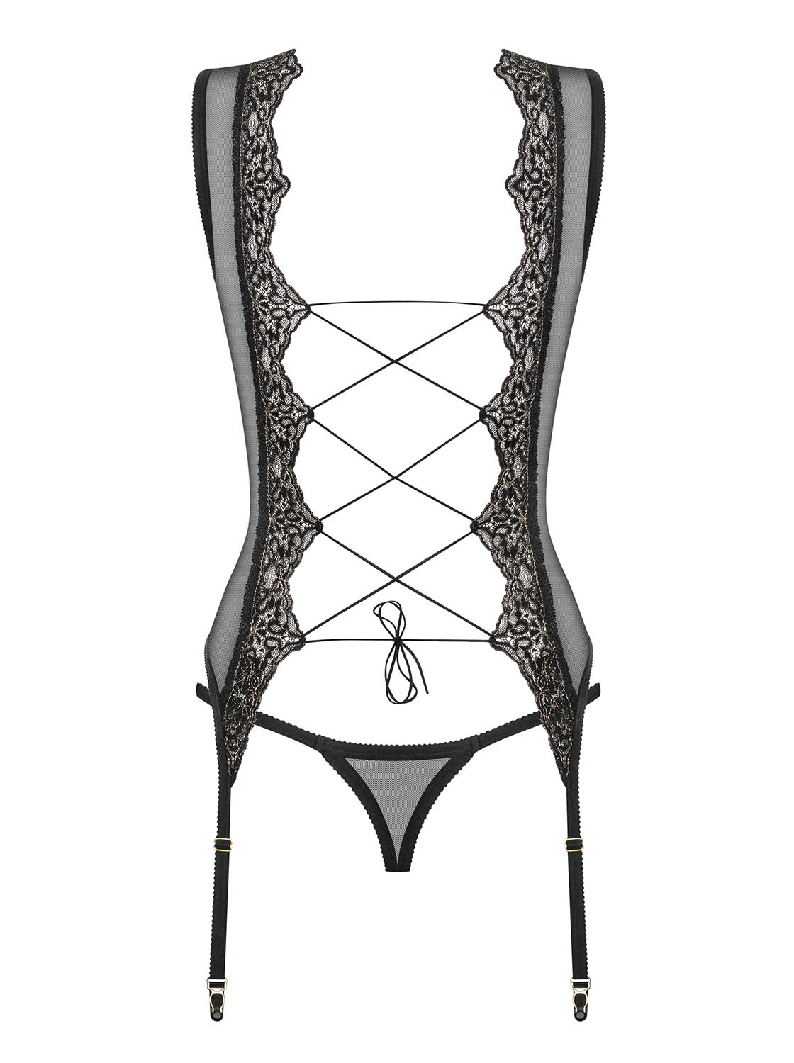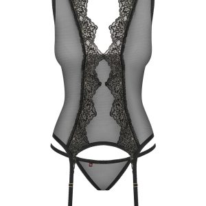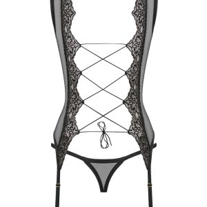 Feminine Corsage aus transparentem und elastischem Mesh. Mit einem einzigartigen Spitzenmotiv, das sich atemberaubend von den Schultern bis zur Hüfte erstreckt. Mit einer phänomenalem Rückenschnürung und verstellbaren Strumpfhaltern. Klassischer, schwarzer String inklusive. Die abgebildeten „S800 Stockings schwarz“ sind nicht im Lieferumfang enthalten und separat erhältlich.