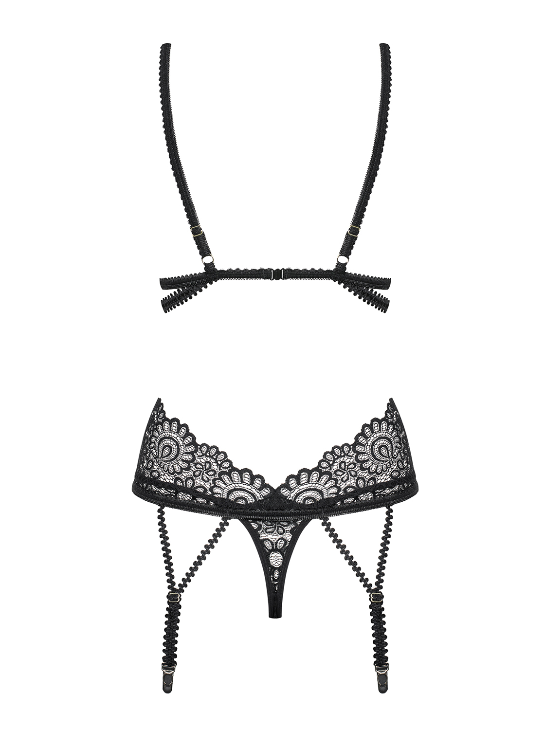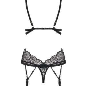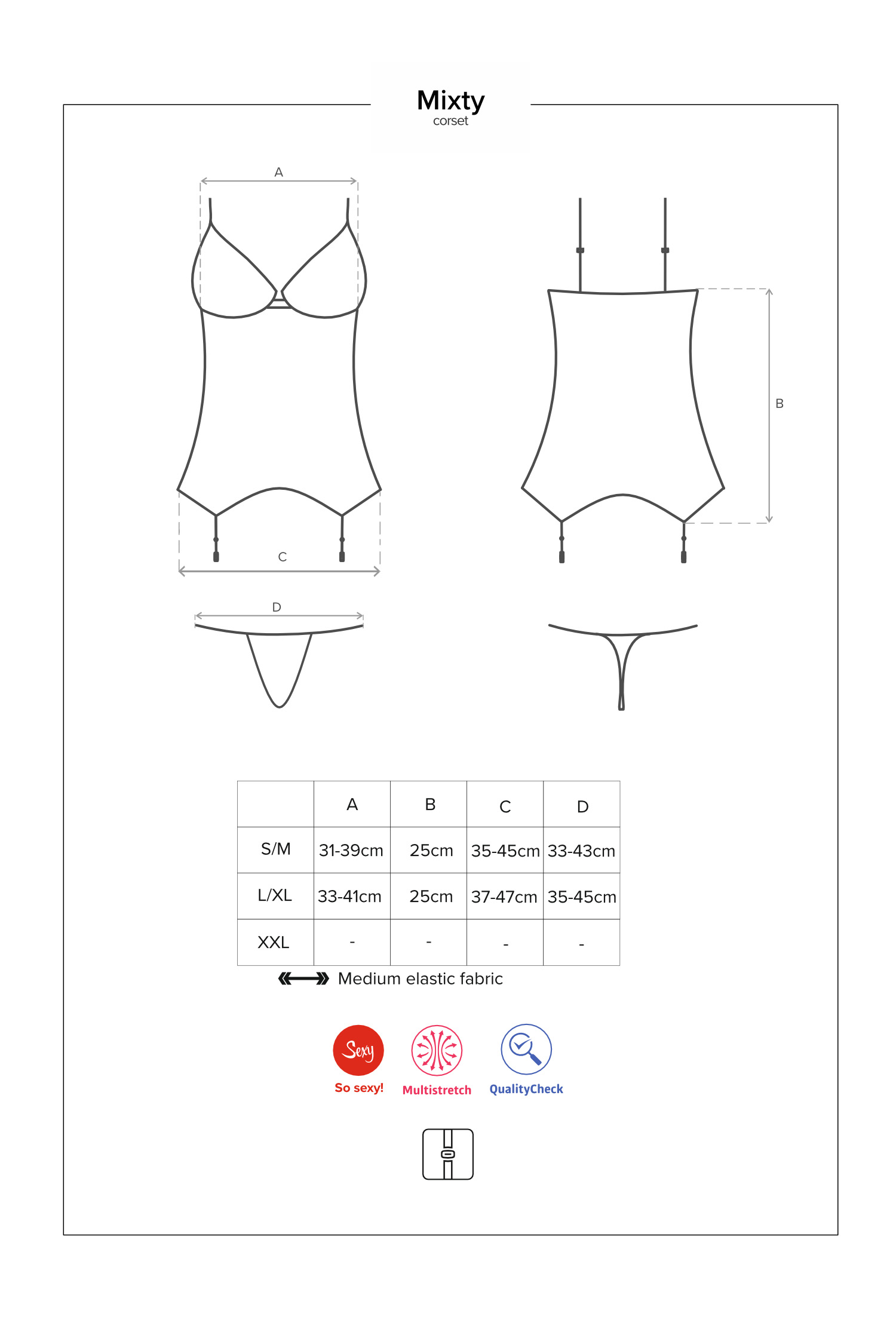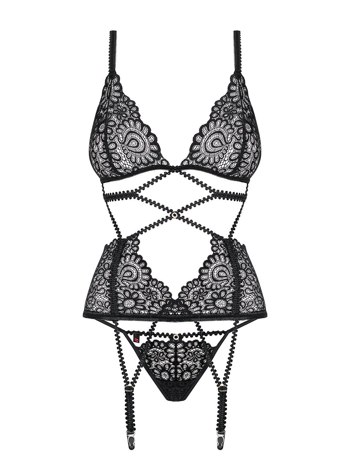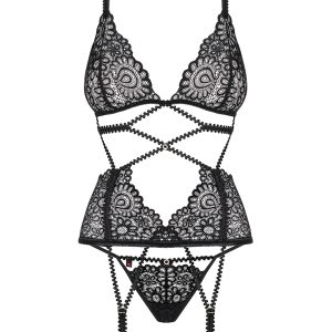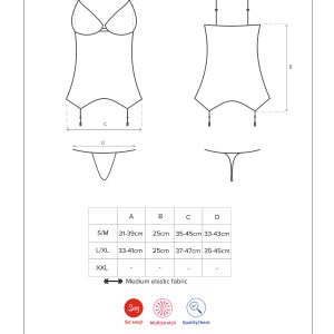 Wunderschöne Spitzencorsage aus zartem Multistretch-Material mit elastischen Riemchen. Mit Rückenverschluss, verstellbaren Trägern und Strumpfhaltern. Die Spitzen-Cups sind mit vertikalen Nähten verziert und zwei glänzende Schmuckdetails setzen einen luxuriösen Akzent. Passender String inklusive. Die abgebildeten „Mixty Stockings“ sind nicht im Lieferumfang enthalten und separat erhältlich.