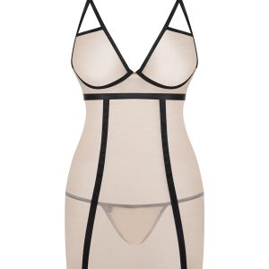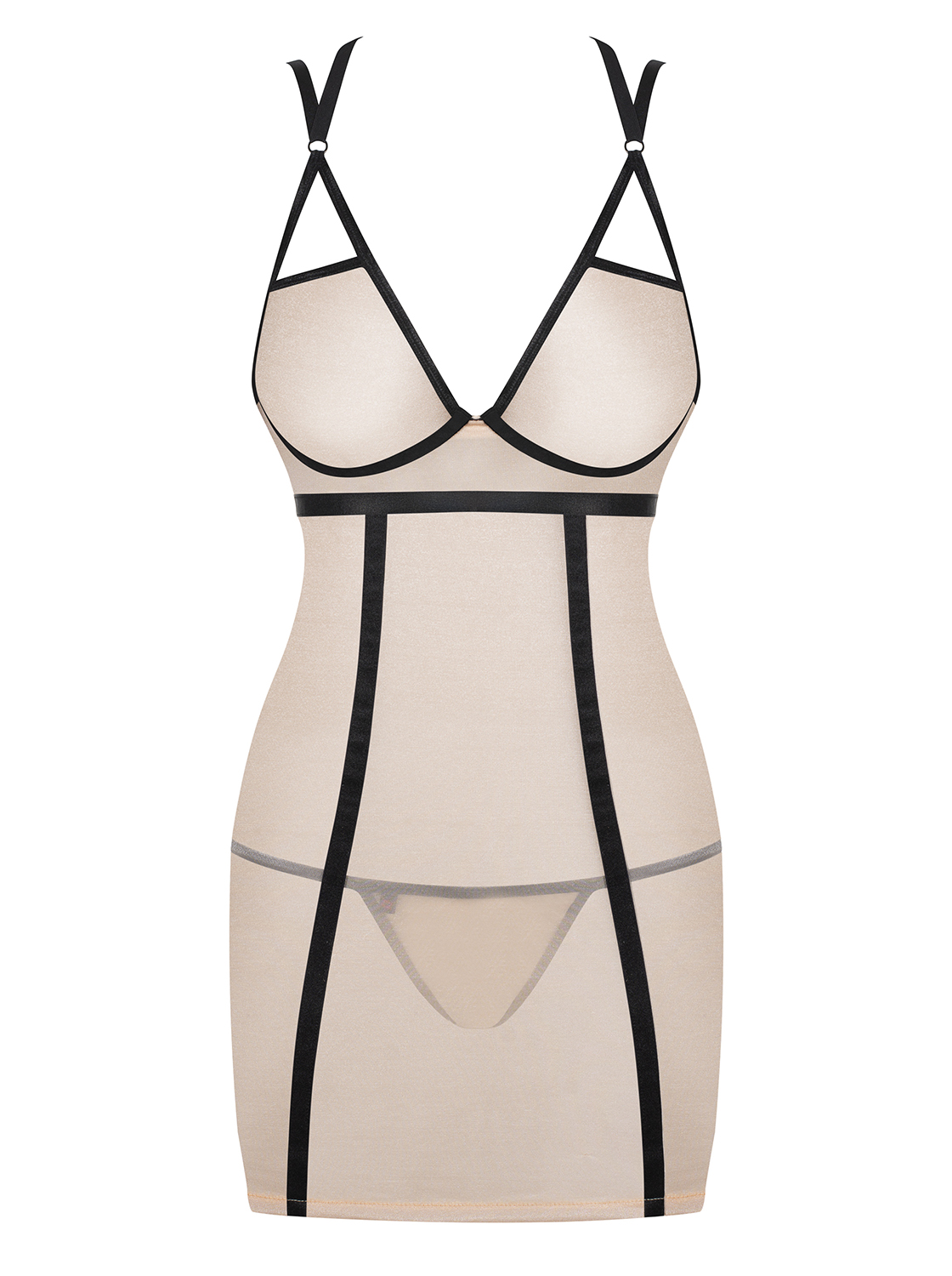 Einzigartiges Chemise aus transparentem und goldschimmerndem Material in Hautfarbe mit schwarzem Streifendesign und dreieckigen Ausschnitten über der Brust und dem Po. Mit verstellbaren Trägern, die sich am Rücken kreuzen, und mehrstufigem Verschluss für eine perfekte Passform. Passender String inklusive. Weiches und elastisches Material, das sich perfekt dem Körper anpasst.