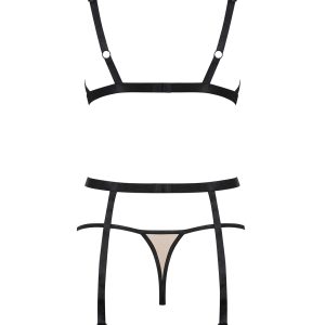 Reizendes Set aus transparentem und goldschimmerndem Material in Hautfarbe mit schwarzem Streifendesign. Ein BH mit verstellbaren Trägern und mehrstufigem Verschluss für eine perfekte Passform. Dazu ein verstellbarer Strumpfhaltergürtel und ein passender String. Die abgebildeten Strümpfe sind nicht im Lieferumfang enthalten. Weiches und elastisches Material, das sich perfekt dem Körper anpasst.