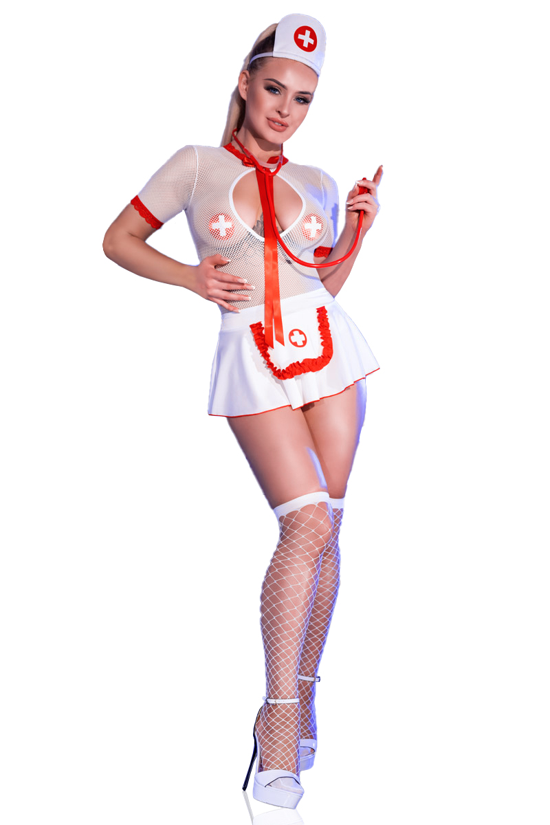 Erotisches Krankenschwester-Set bestehend aus Netz-Body, Rock, Haube, Satinband, Stethoskop, String, Nipple Covers und Netzstrümpfen. Aus weißem und elastischem Material. Perfekte Passform und angenehm zu tragen.