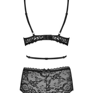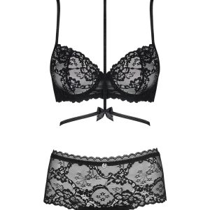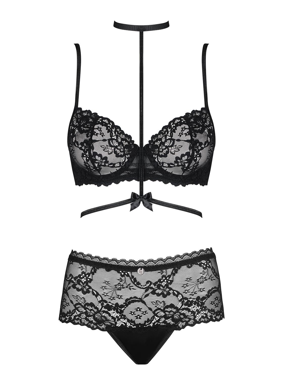 Feminines Set aus durchscheinender und elastischer Spitze in schwarz. Ein BH mit Bügelcups, verstellbaren Trägern und mehrstufigem Verschluss für eine perfekte Passform. Der Saum ist zusätzlich mit Spitze verziert, ein abnehmbares Halsband umspielt Hals und Taille. Dazu passende Shorties mit einem silberfarbenen Anhänger vorne und einer Satinschleife über dem Po.