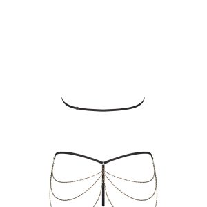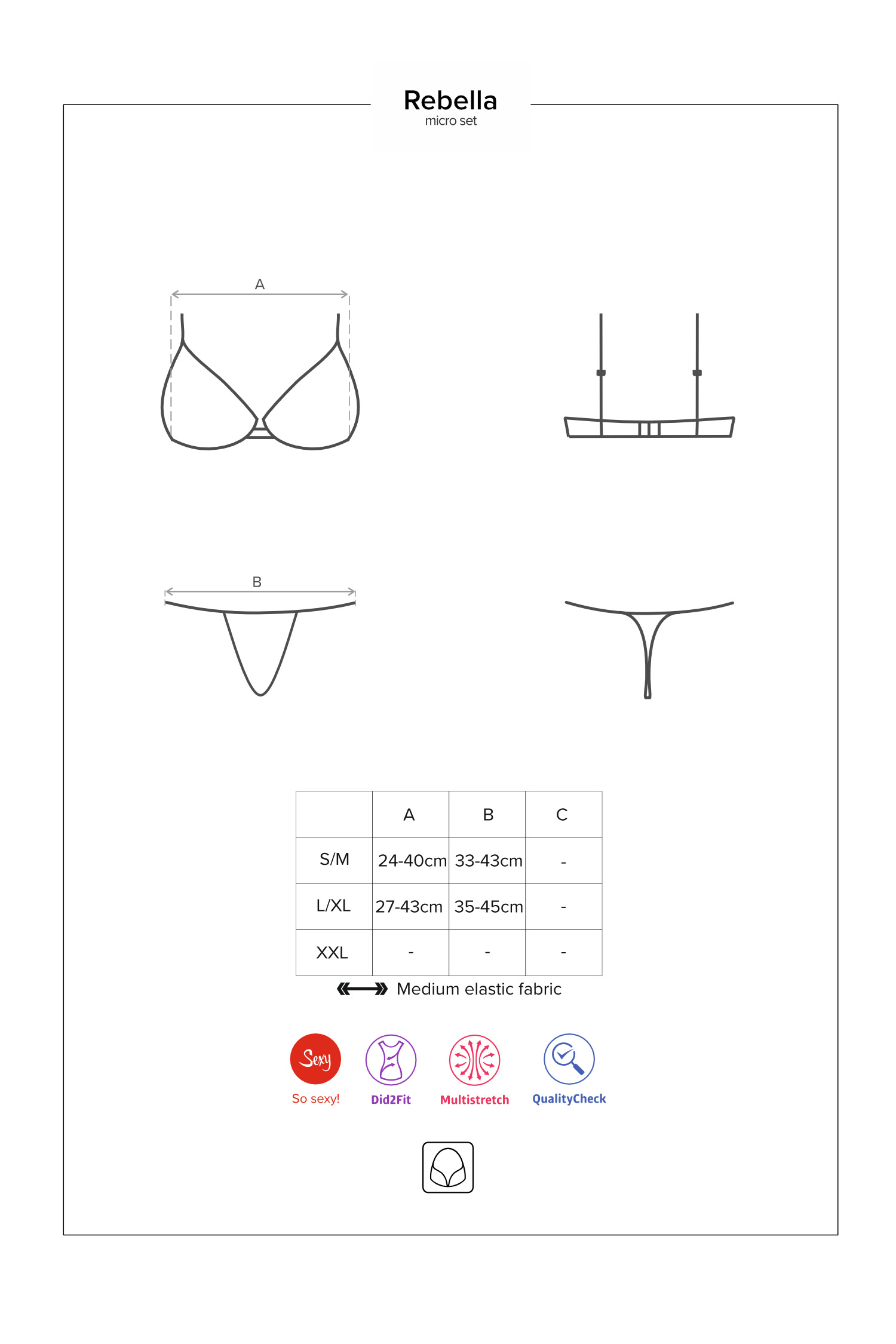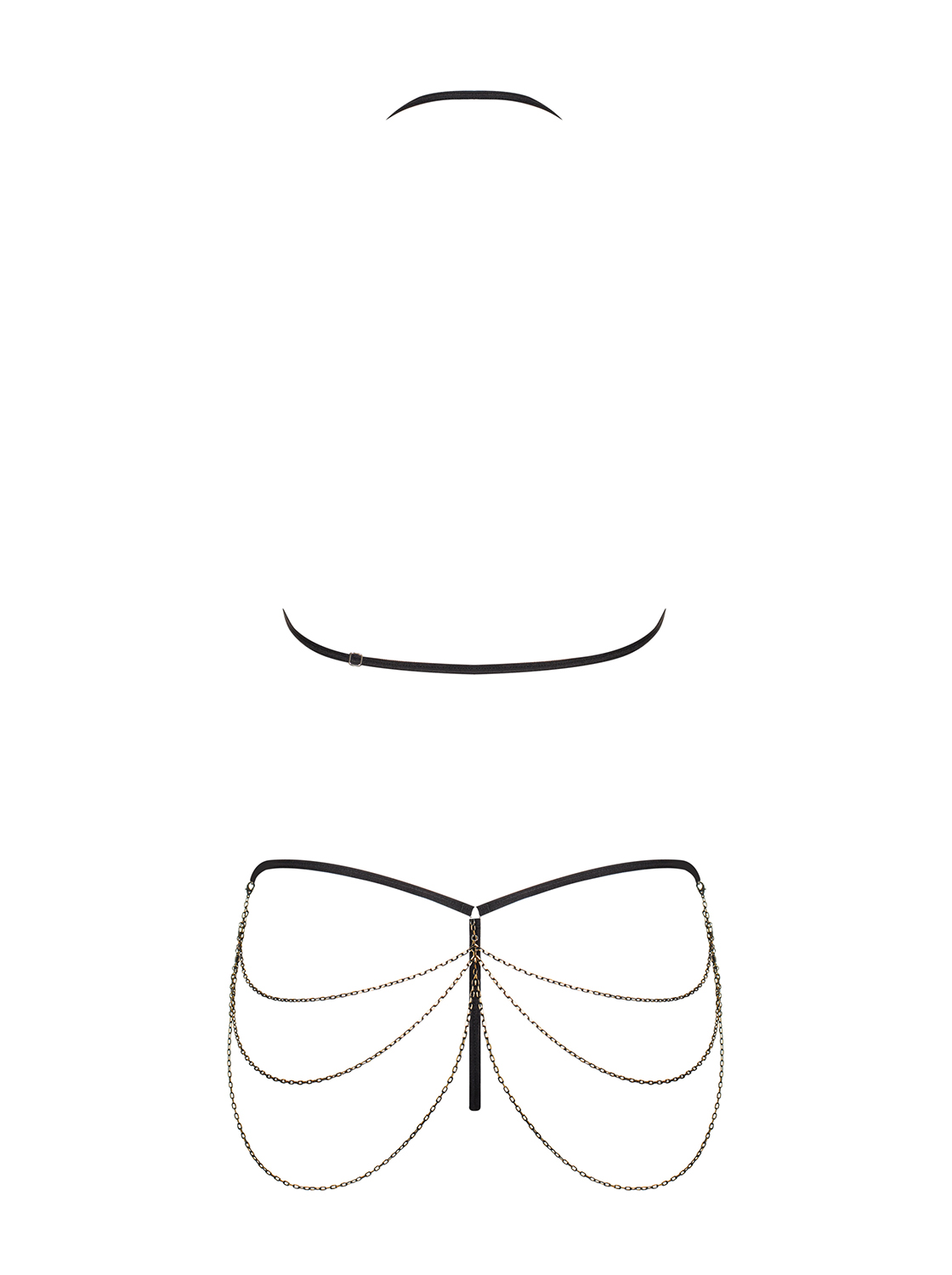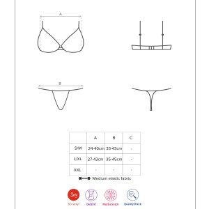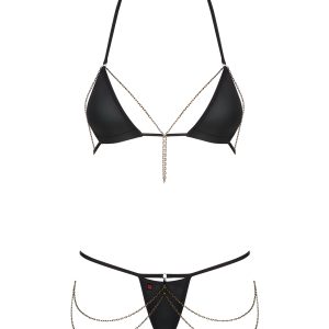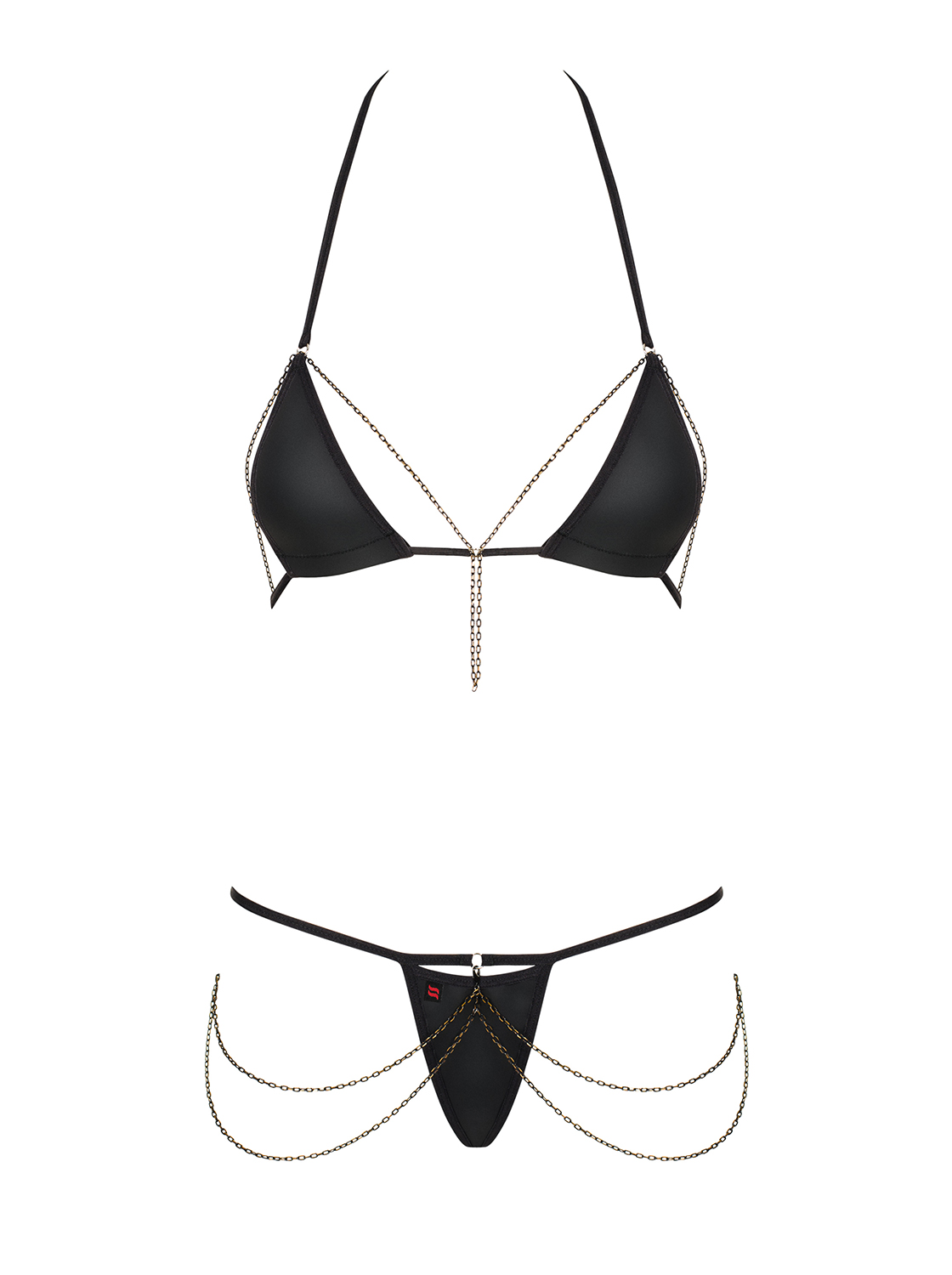Wunderschönes Dessous-Set aus elastischem Material. Bestehend aus einem verstellbaren Neckholder-BH, einem String und abnehmbaren Zierketten.