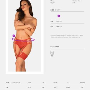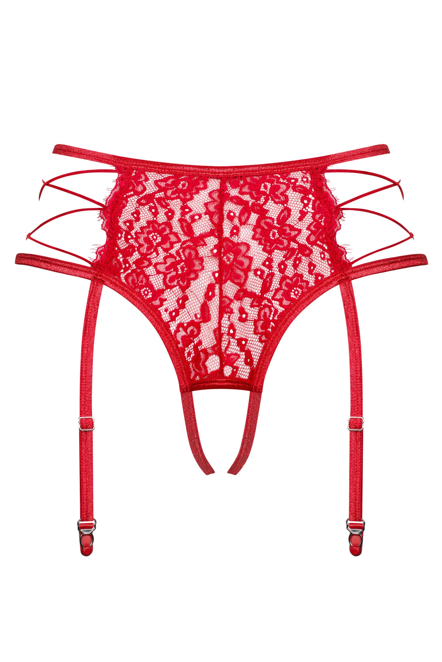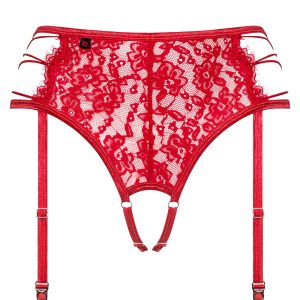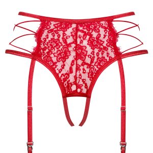 Roter Strumpfhaltergürtel und integrierter String in einer reizenden Kombination aus transparenter Spitze und ineinander verschlungenen Riemchen an den Seiten. Mit verstellbaren Strumpfhaltern und Trägern im offenen Schritt für eine perfekte Passform. Angenehmes und elastisches Material.