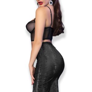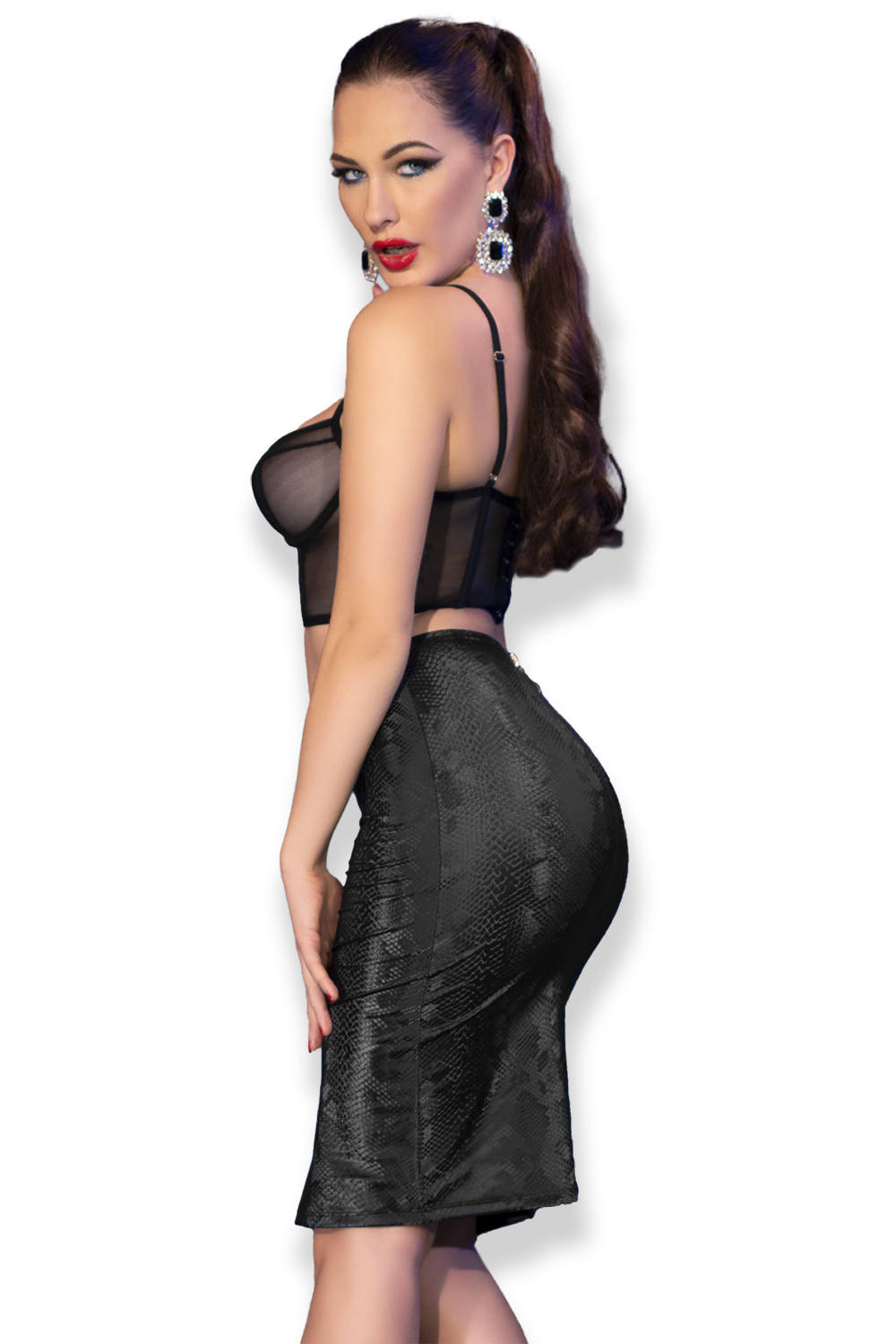 Exotischer Rock aus weichem und lederähnlichem Material mit Schlangenmuster-Print und einem silberfarbenen Reißverschluss auf der Rückseite.