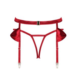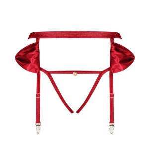 Verspielter, roter Strumpfhaltergürtel, der mit einem offenen String kombiniert ist. Kokette Satinschleifen an den Seiten betonen die Hüfte. Mit verstellbaren Strumpfhaltern und einem glänzenden Schmuckdetail auf der Vorderseite. Weiches und elastisches Material. Die abgebildeten „S808 Stockings“ sind nicht im Lieferumfang enthalten und separat erhältlich.
