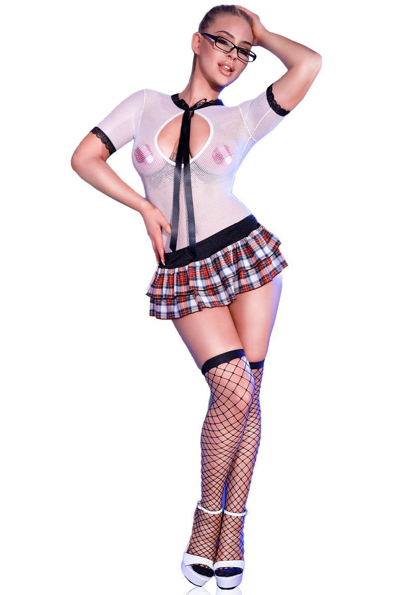 Sexy Schulmädchen-Outfit mit einer verspielten Kombination aus einem erotischen Netz-Body mit langer Schleife und einem karierten Röckchen. Im Set enthalten: Body, Rock, Netzstrümpfe, Nipple Covers und Brille.