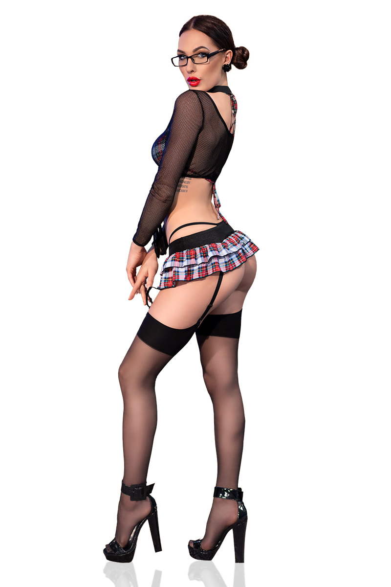 Sexy Schulmädchen-Set in einer außergewöhnlichen Kombination aus elastischem Netz-Top, kariertem Röckchen mit verstellbaren Strumpfhaltern und BH. Inklusive Brille, Krawatte, String und Strümpfe.