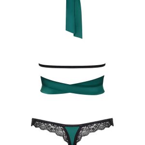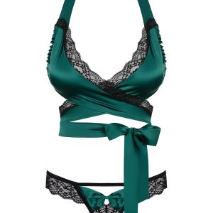 Wunderschönes Set aus seidig weichem Material in grün mit eleganter, schwarzer Spitze. Das Top wird im Nacken und um die Taille mit einem Satinband gebunden. Der passende String ist vorne mit einer charmanten, grünen Schleife verziert.