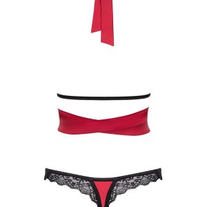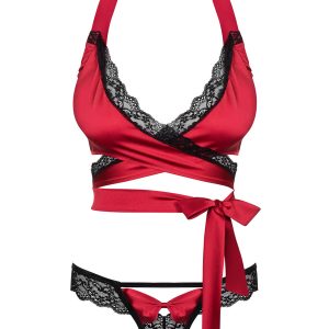 Wunderschönes Set aus seidig weichem Material in rot mit eleganter, schwarzer Spitze. Das Top wird im Nacken und um die Taille mit einem Satinband gebunden. Der passende String ist vorne mit einer charmanten, roten Schleife verziert.