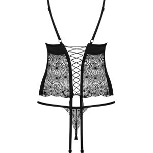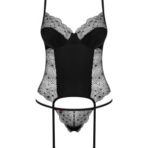 Feminine Corsage aus weichem und elastischem Material mit wunderschöner Spitze am Dekolleté, und an den Seiten. Mit verstellbaren Trägern und Strumpfhaltern sowie weiche Bügelcups und Rückenschnürung für eine perfekte Passform. Passender Spitzenstring inklusive. Die abgebildeten Strümpfe sind nicht im Lieferumfang enthalten und separat erhältlich.