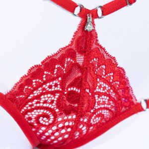 Erotischer String aus weicher Spitze mit elastischen Doppelriemchen, die mehrfach verstellbar sind. Ein glänzendes Schmuckelement verleiht ihm einen Hauch von Eleganz.