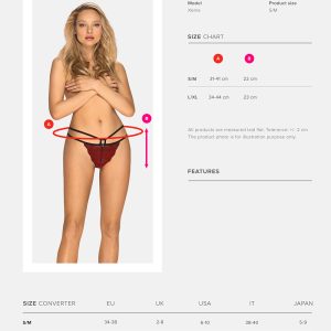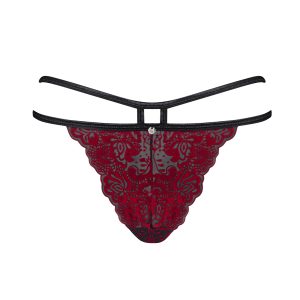 Elegantes Höschen in schwarz mit rotem Samtmuster und einem außergewöhnlichen Riemchendesign, das die Hüfte betont. Mit einem dreieckigen Ausschnitt über dem Po. Angenehmes und elastisches Material.