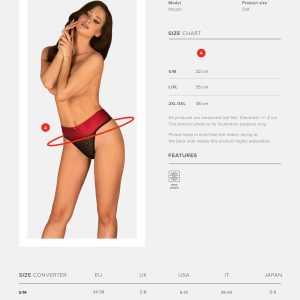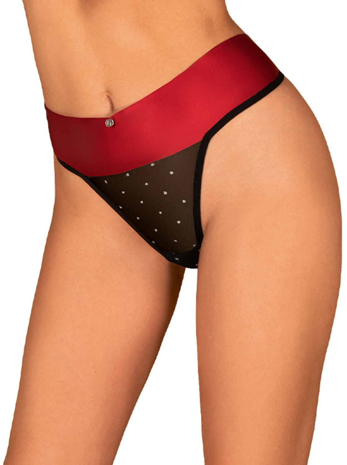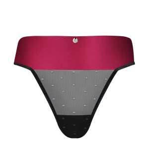 Einzigartiger String aus durchscheinendem Material in schwarz mit glitzernden Punkten. Das breite Satinband betont die Hüfte und ist über dem Po zu einer auffälligen Schleife gebunden. Mit einem glänzenden Schmuckanhänger unter dem Bauchnabel. Weiches und elastisches Material.
