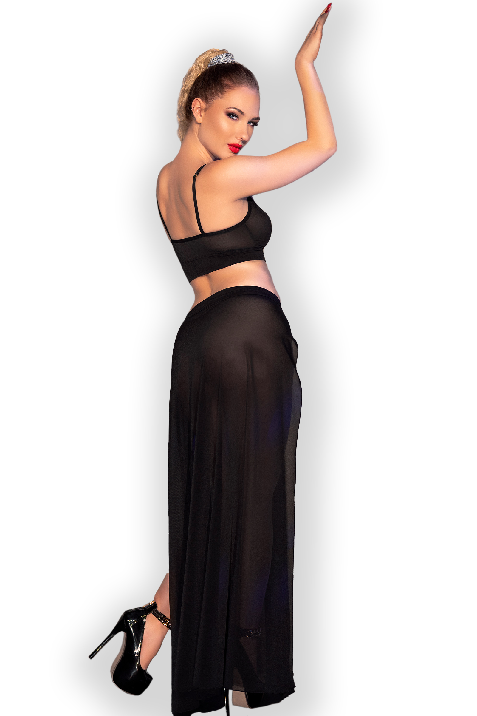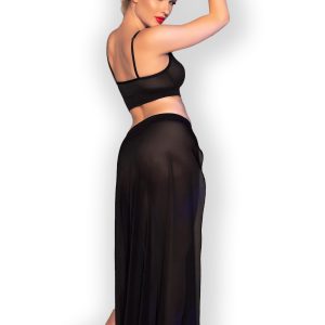 Glamouröses Set aus schwarzem Mesh mit goldfarbenen Ketten. Ein Top mit verstellbaren Trägern und abnehmbaren Ketten am Dekolleté,. Ein langer Rock mit abnehmbaren Ketten und zwei Schlitzen, die Ihre Beine verführerisch in Szene setzen. Dazu ein passender String.