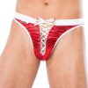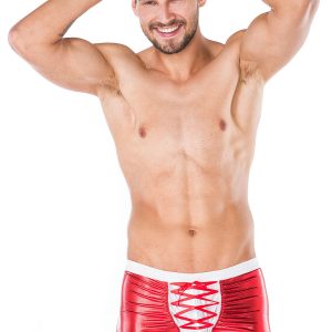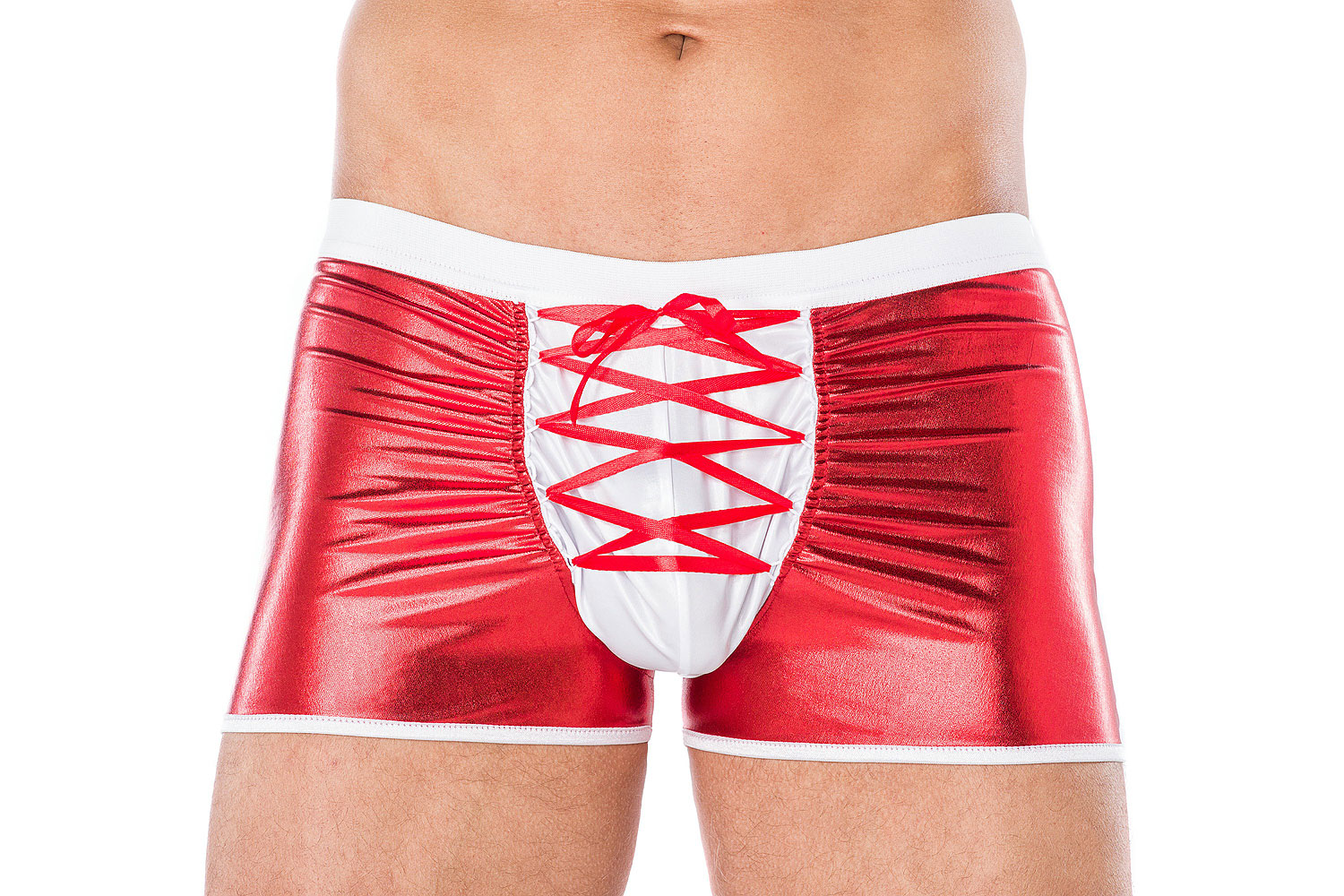 Weihnachts-Boxershorts aus rotem Wet-Look-Material mit einer weißen Schnürung auf der Vorderseite. In exklusiver, neutraler Geschenkverpackung in mattschwarz!